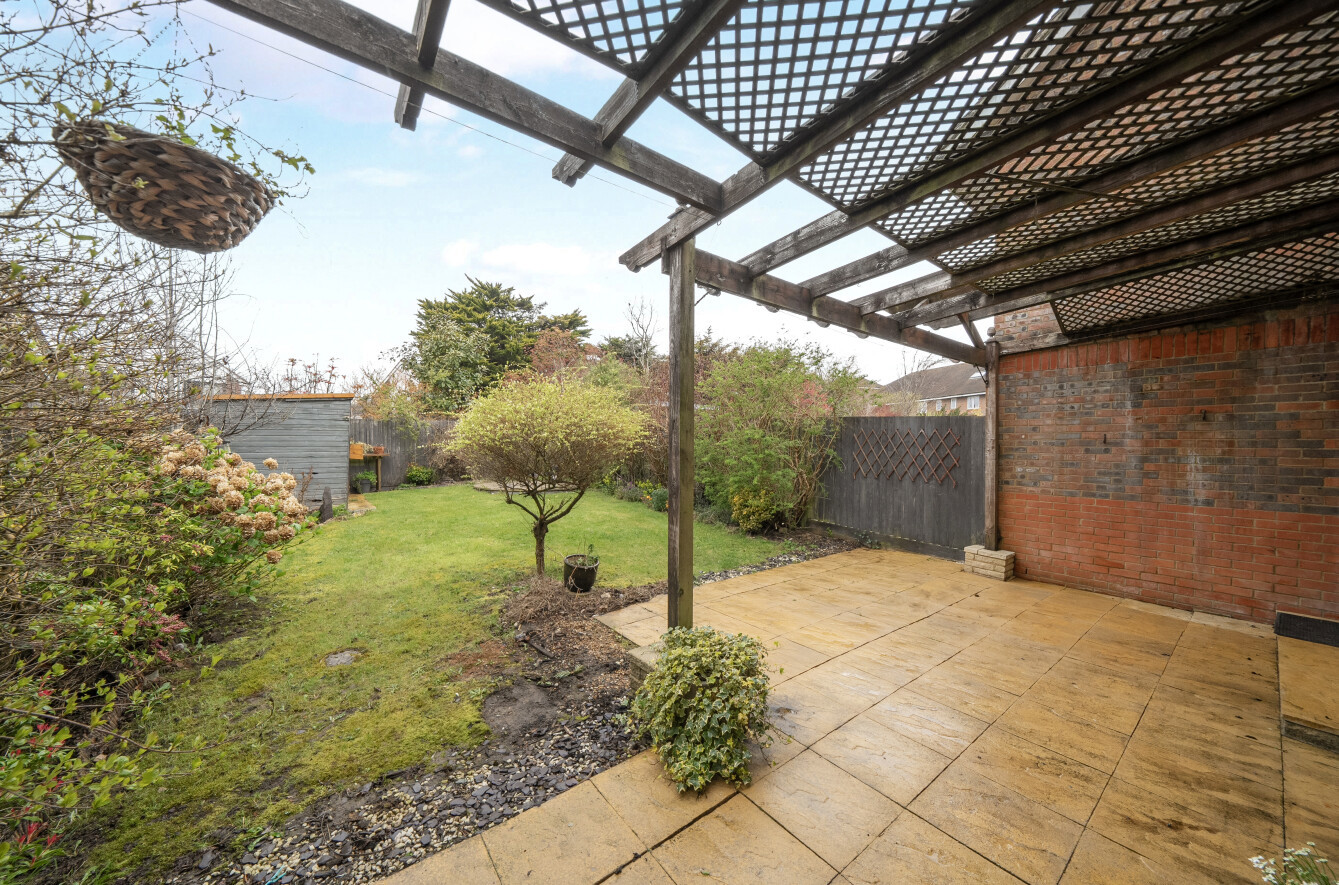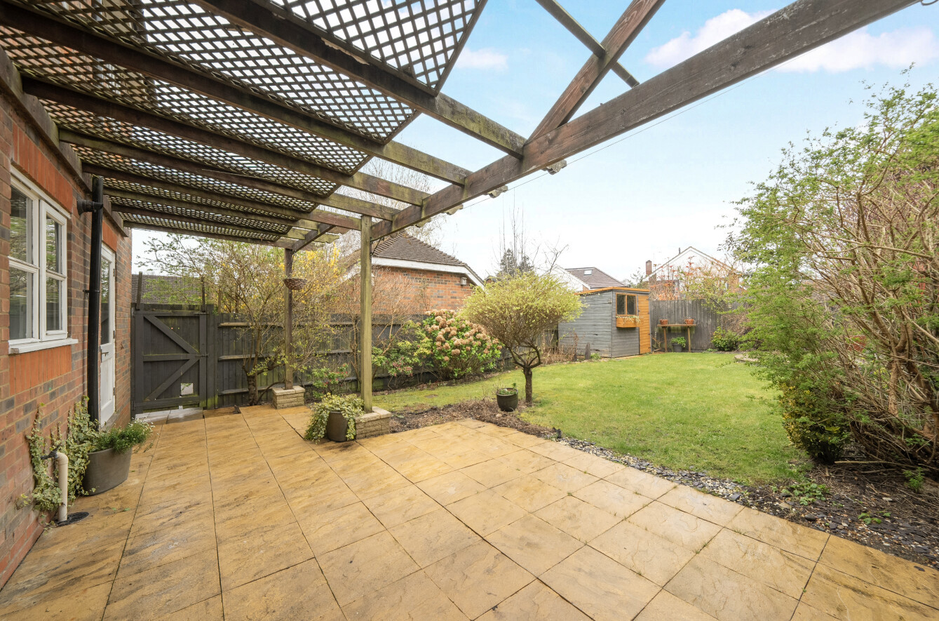 Large covered patio adjacent to the house with a further circular patio to the rear with the remainder predominantly laid to lawn with mature shrubs to the boundaries. A side gate leads out to a parking area