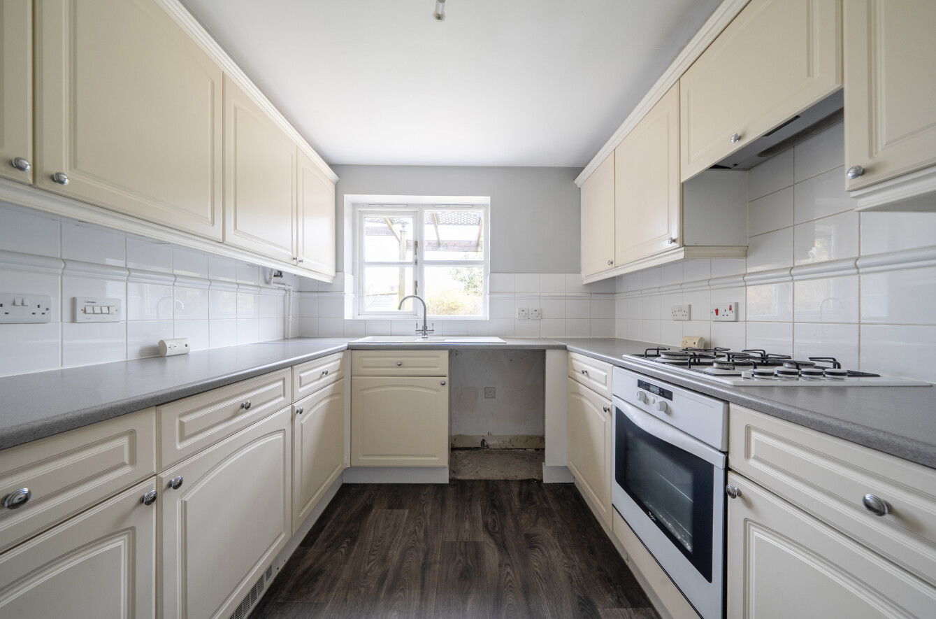 Rear aspect fitted kitchen with a range of drawer and cupboard storage with integrated oven, gas hob and fridge with space and plumbing for a washing machine