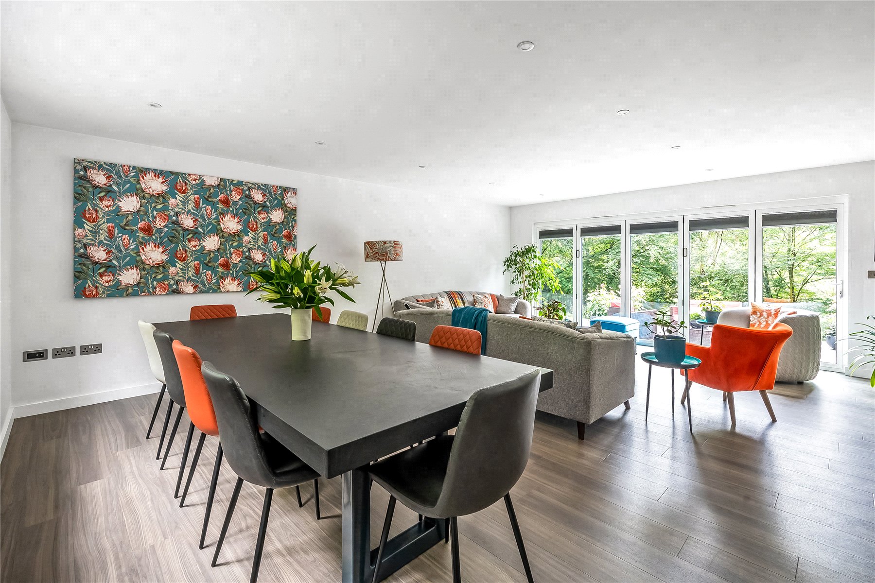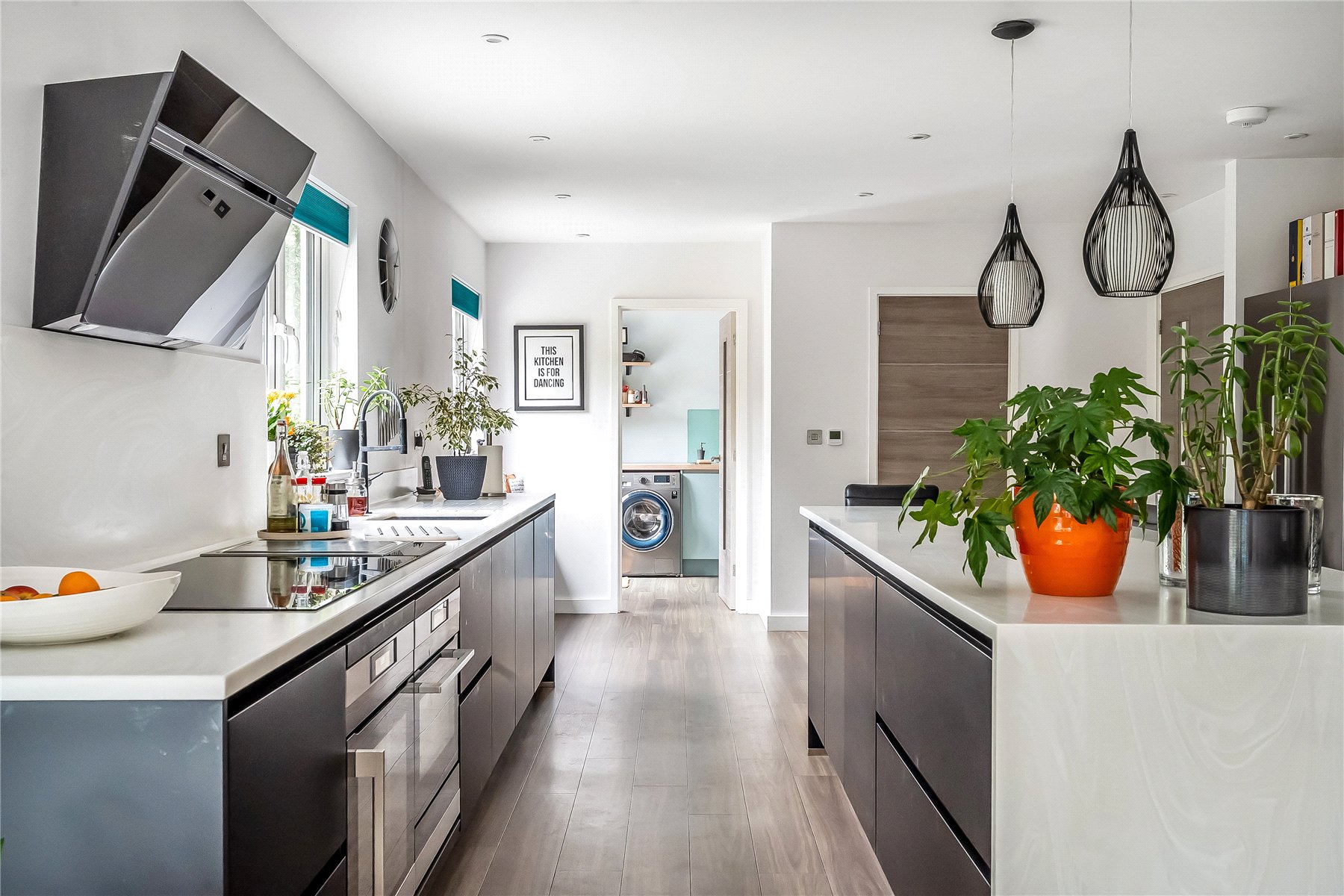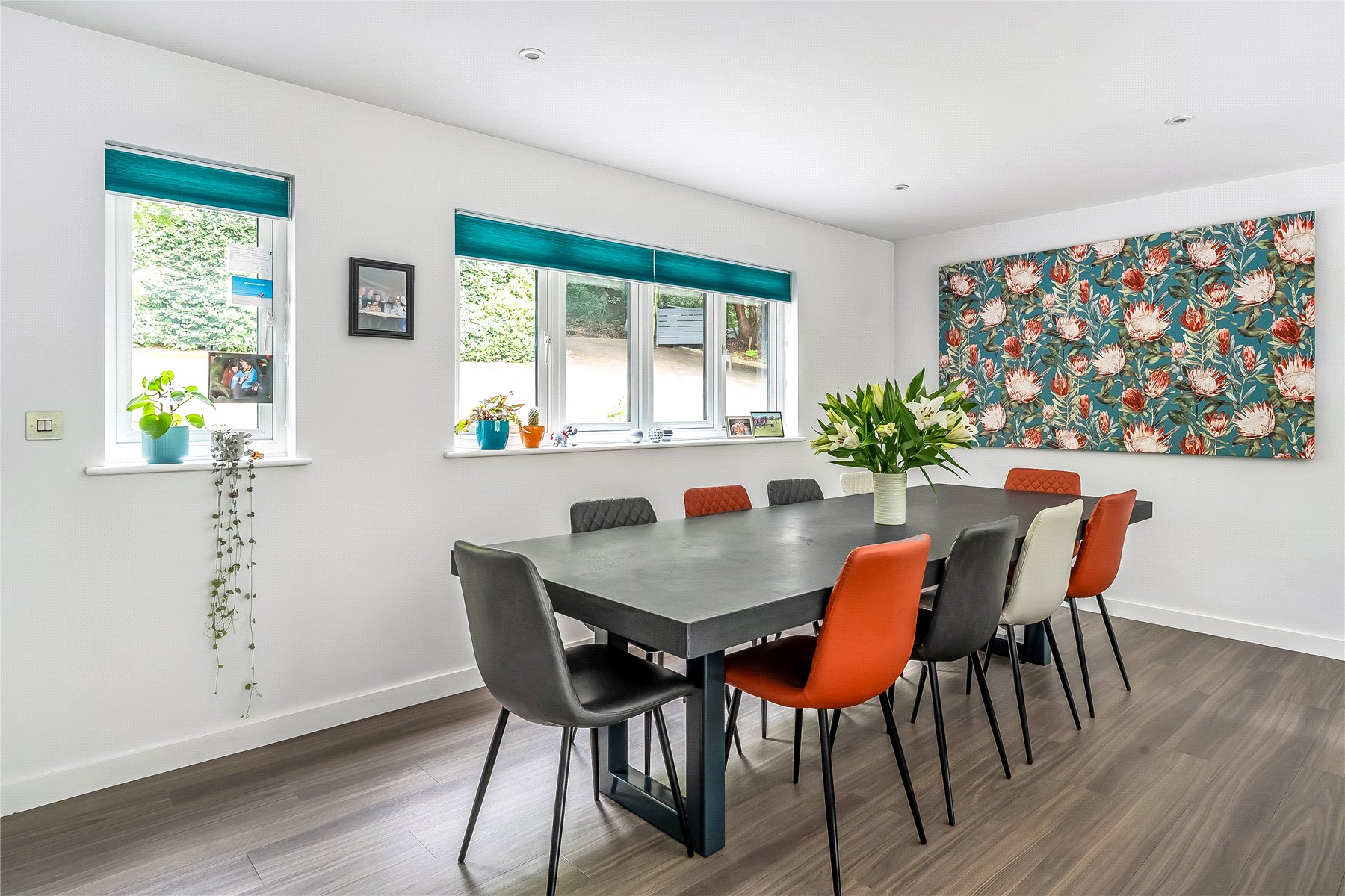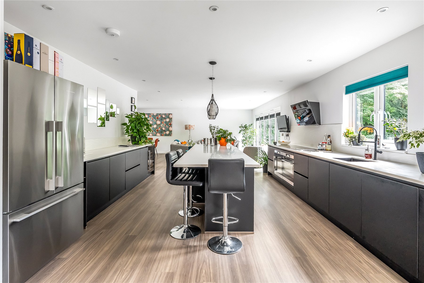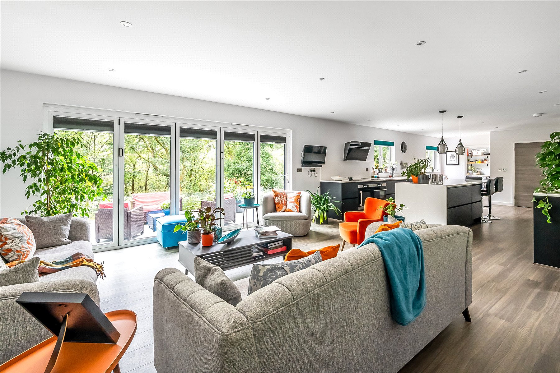 Extending across the rear is a breathtaking open plan kitchen/dining room/family lounge with stunning views onto the garden and woodland beyond. The double aspect dining/family area provides a flexible space, currently accommodating a 3m long dining table! A bank of bifold doors provide an almost panoramic view over the gardens. Amtico flooring extends into the kitchen area, which is fitted with a luxury range of drawer and cupboard storage, including a central island, topped with Corian worksurfaces. There are quality integrated appliances including double oven, induction hob, Teppanyaki hot plate, dishwasher, wine fridge and bin store. This is complemented by a walk in larder. When the chef requires a break from creating culinary masterpieces there is a charming bench seat under the window; the perfect spot for a brew while spotting birds or wildlife in the garden. A separate utility room completes the ground floor accommodation.