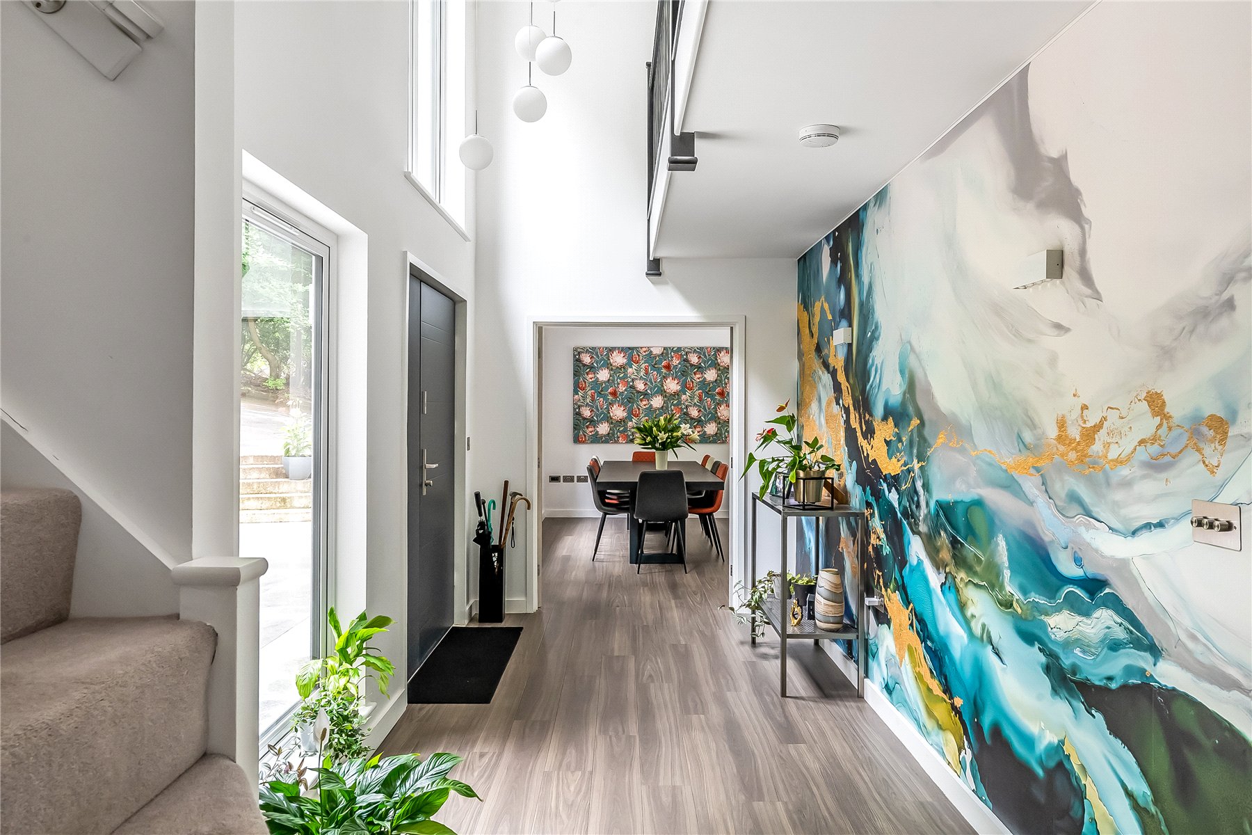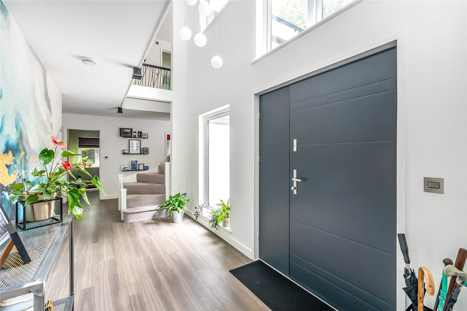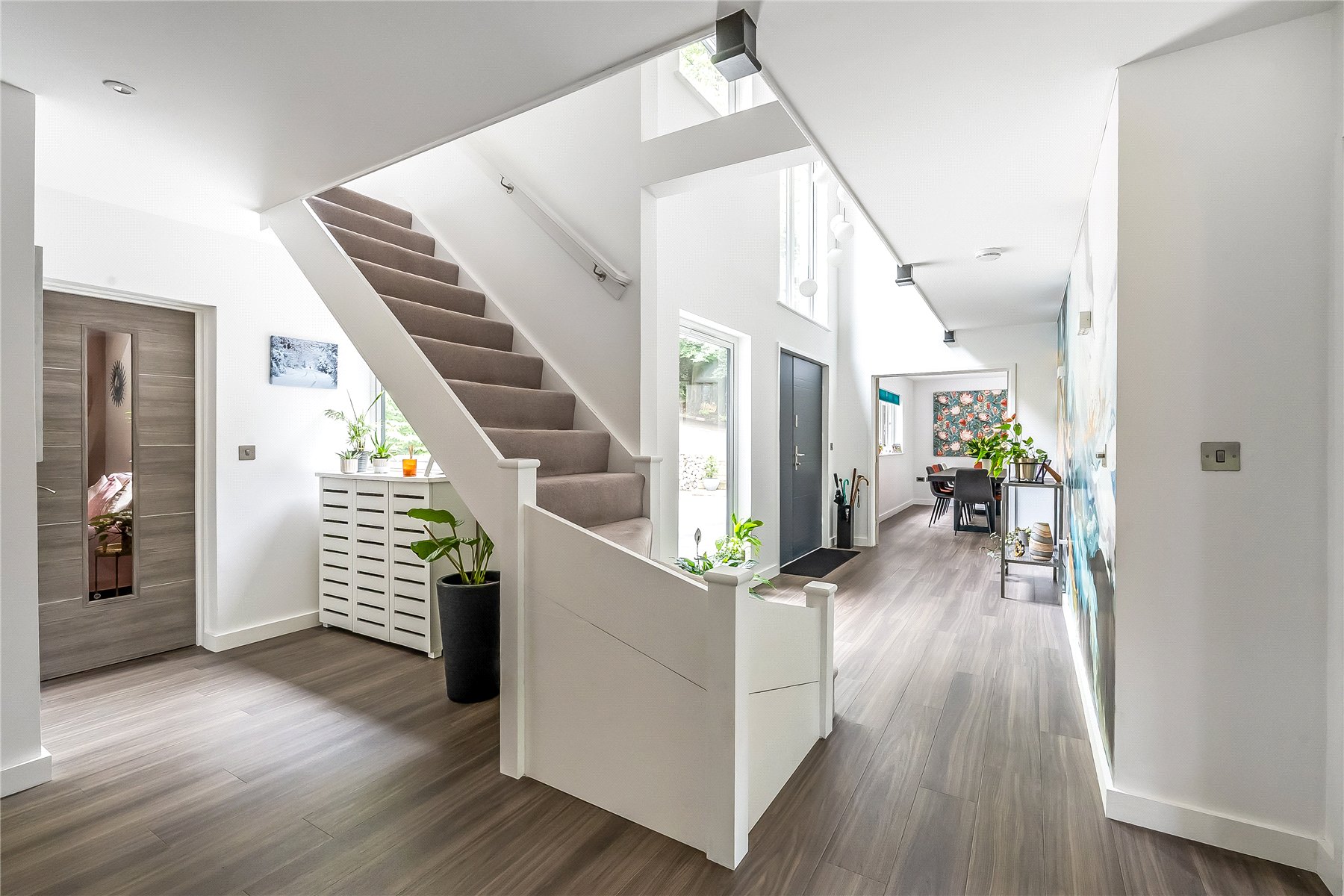 Steps from the drive lead down to a welcoming porcelain tiled paved terrace to the front and side of the house, and to the front door. This itself opens into a wonderful part vaulted entrance hall. From the moment you step through the front door you get to appreciate underfloor heating which extends throughout the ground floor.