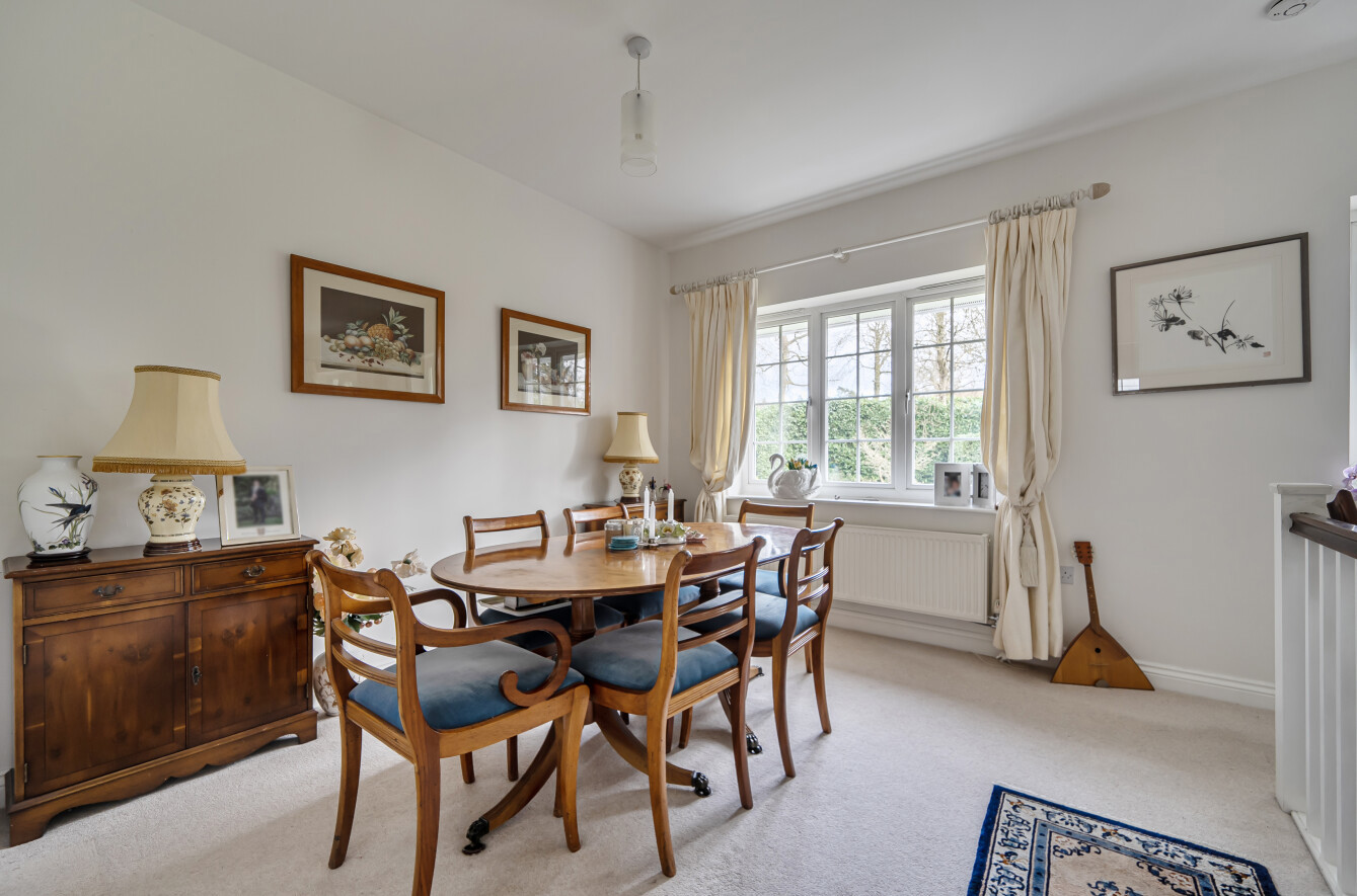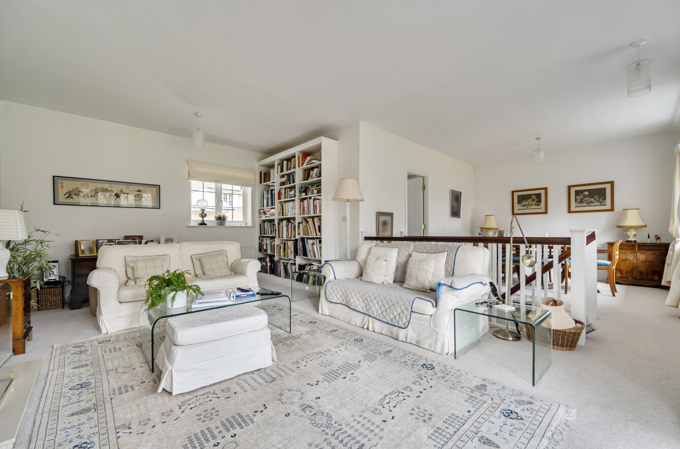 Stairs to first floor opening into a double aspect sitting room enjoying direct access onto a south facing private decked terrace and communal gardens beyond. The room is open plan to good sized dining room