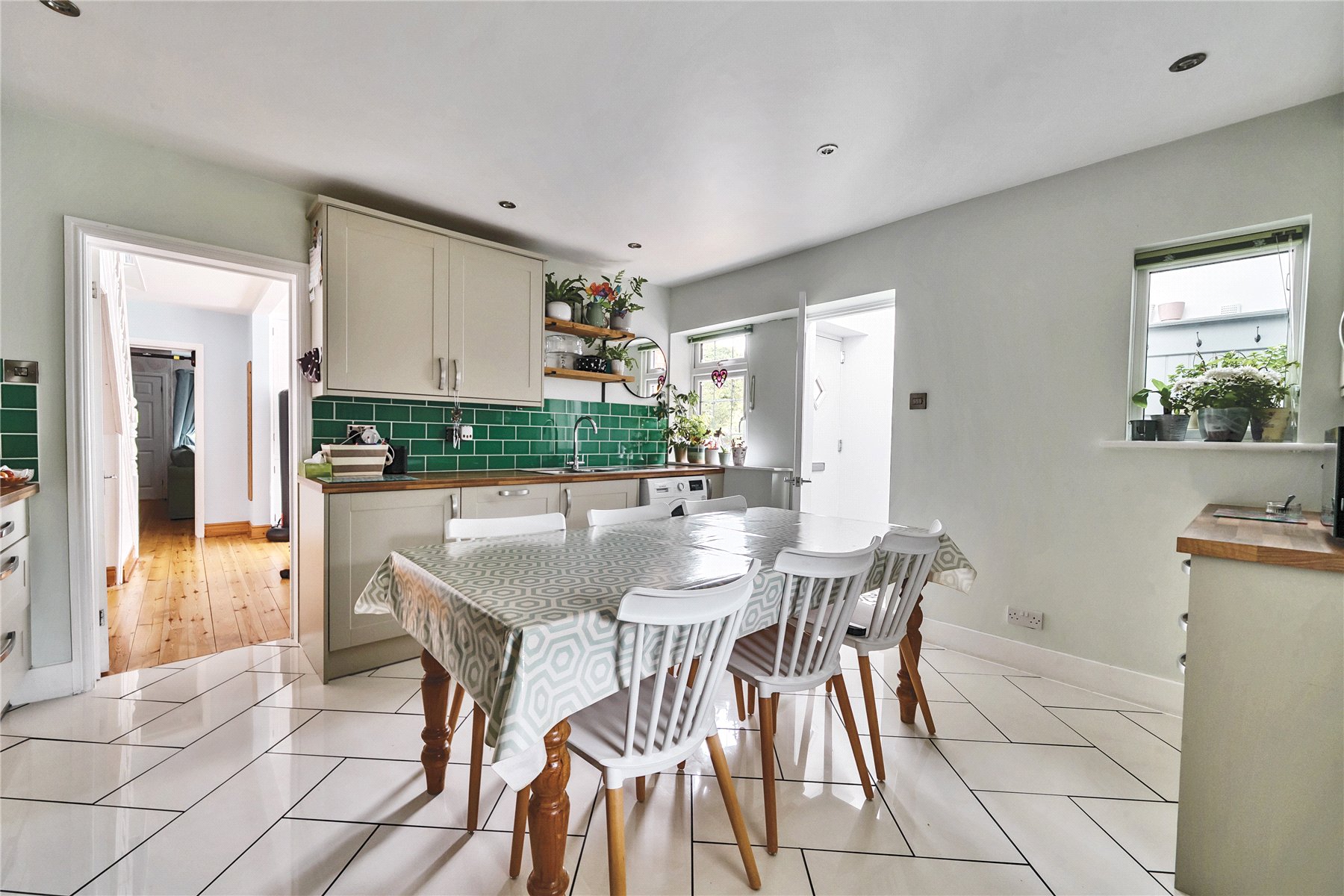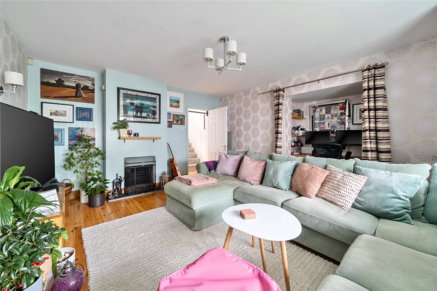 There are two entrances to the house: a side boot room (with lots of storage) opens into the kitchen which is probably the one you would use day to day, and one to the front which is where you would greet guests. This front door opens into an entrance hall and then the sitting room beyond with south facing bay window to the front, study nook and central open fire. Wooden flooring extends though from the sitting room into the dining room behind. This is a good sized reception room also with a fireplace and a west facing bay window, as well as a useful under stairs storage cupboard.