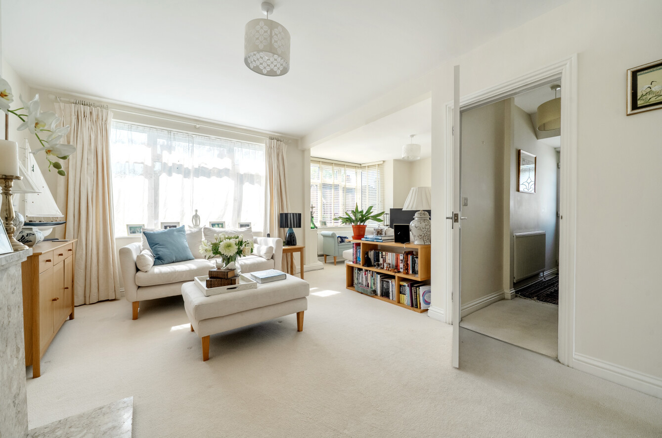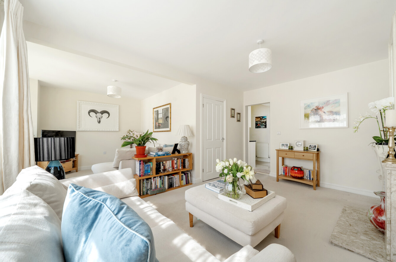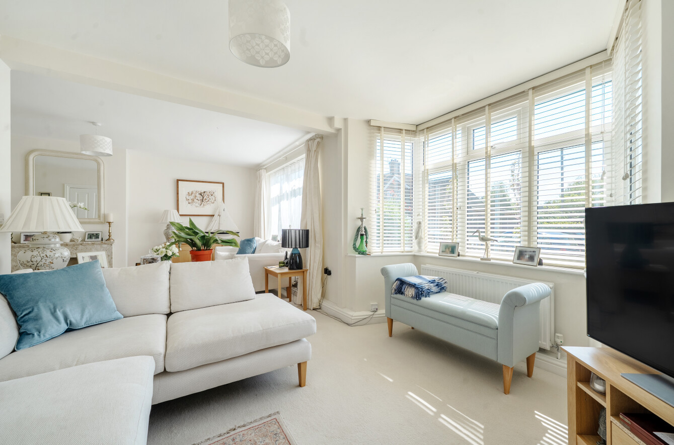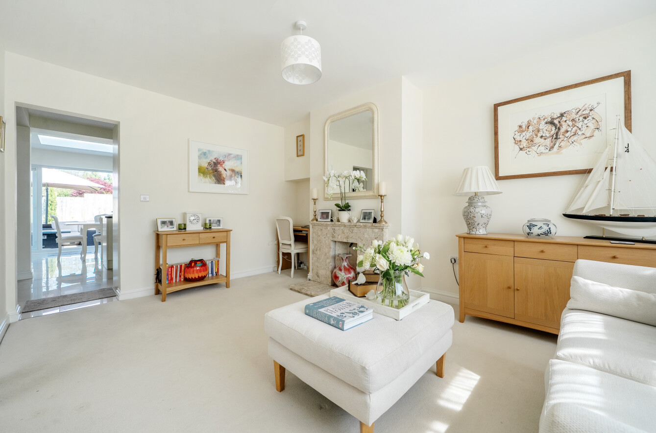 A door takes you through into a large L-shaped sitting room with feature (working) fireplace and lovely front aspect bay window.