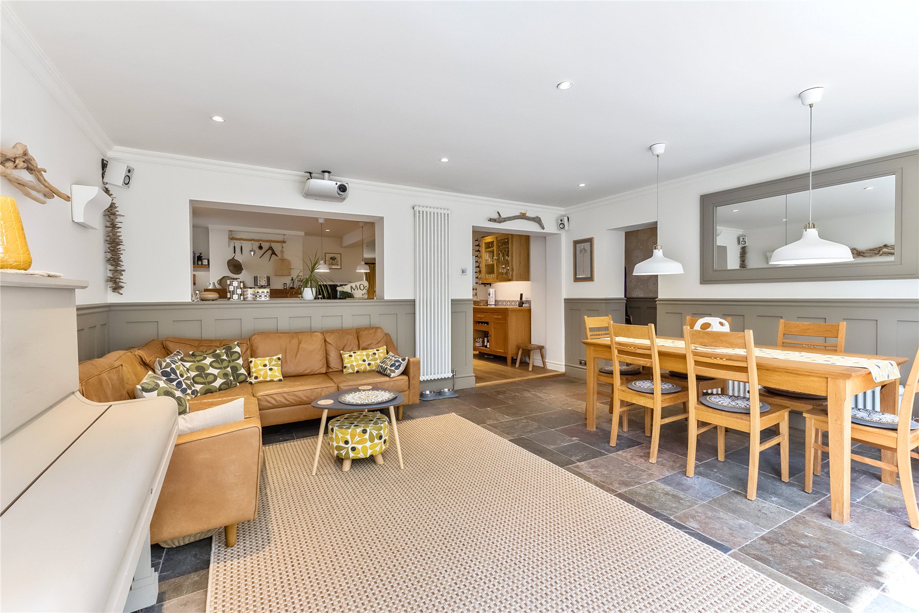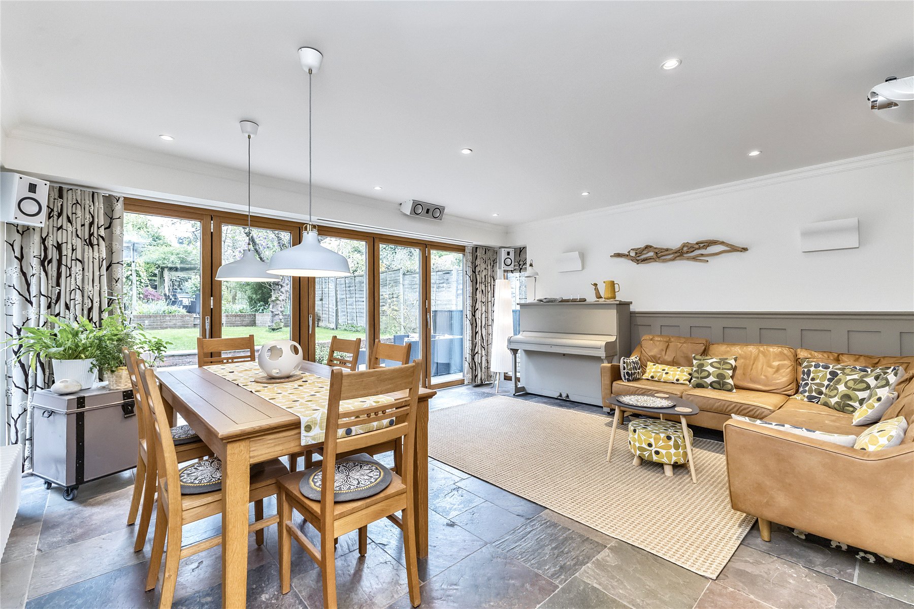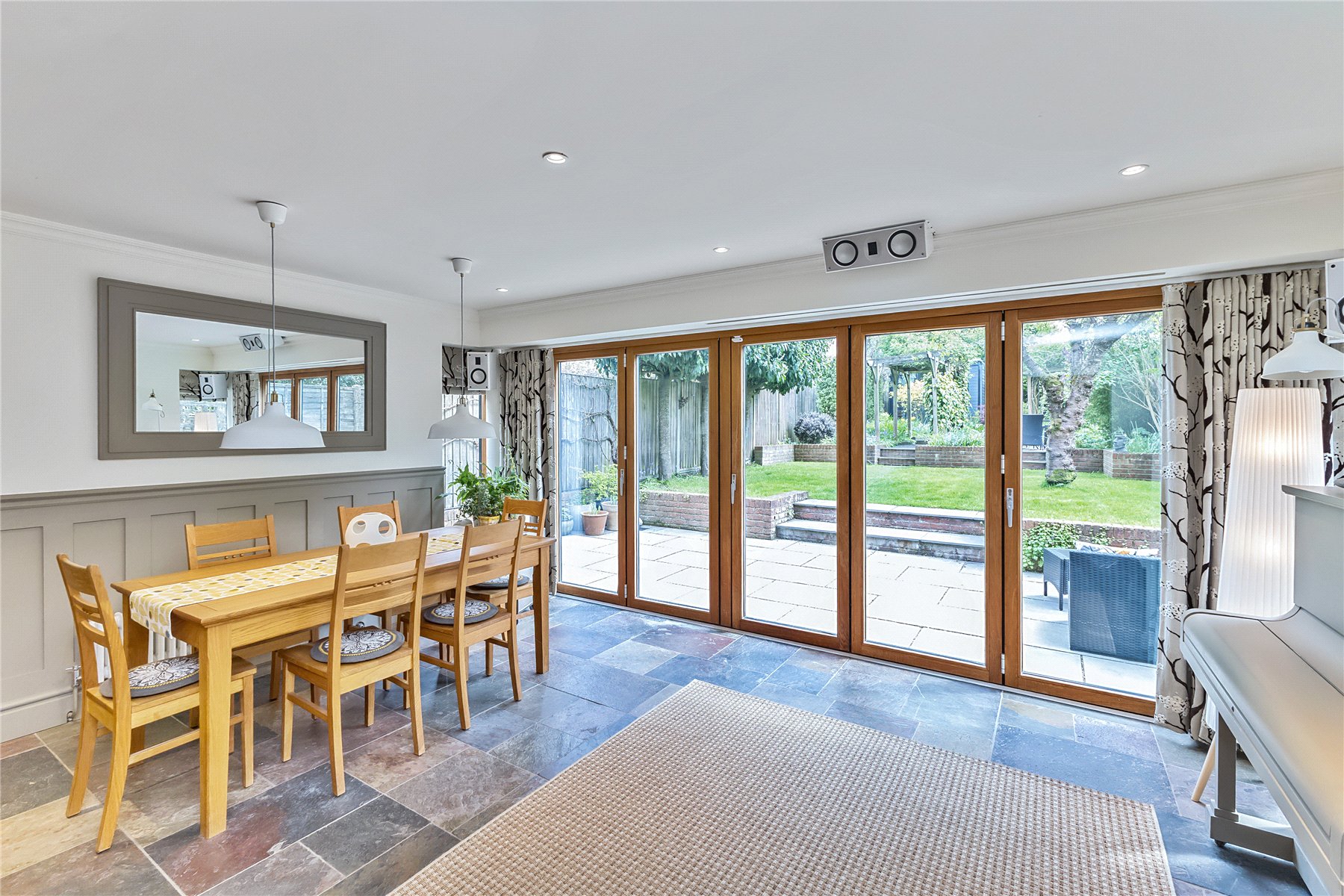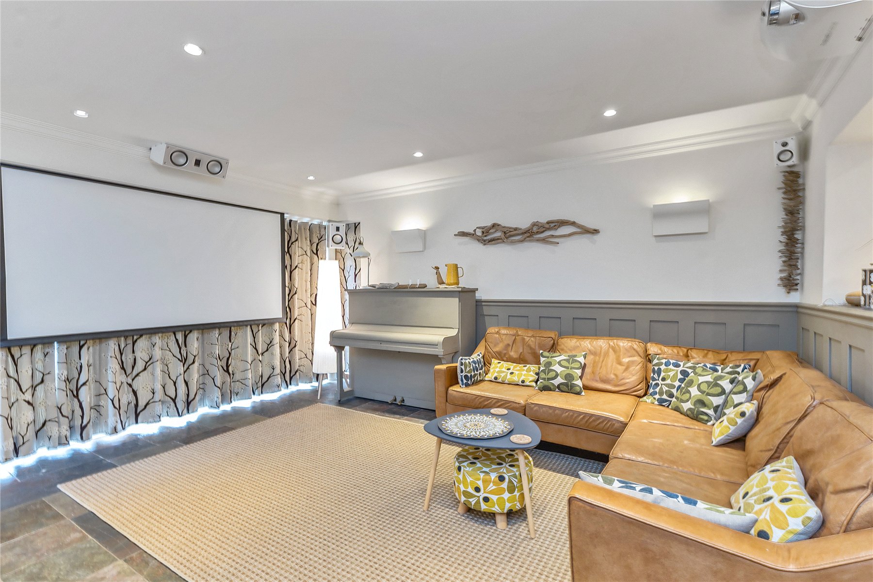 However, the real family space of the home is found extending across the whole of the rear of the property, benefitting from a triple aspect and overlooking the stunning gardens, with south facing bi-folding doors allowing plenty of natural light to flood the room. This generous room has space for both dining and lounge furniture with attractive part panelled walls as a back drop. Clever use of technology can transform this room at the touch of a button into a cinema room; curtains close, lights dim and a projection screen drops from the ceiling, and sonus speakers provides accompanying surround sound. Imagine watching great movies, live sporting events, and magnificent wildlife programmes. Music shows suddenly taking on a concert like atmosphere; all from the comfort of your own home.