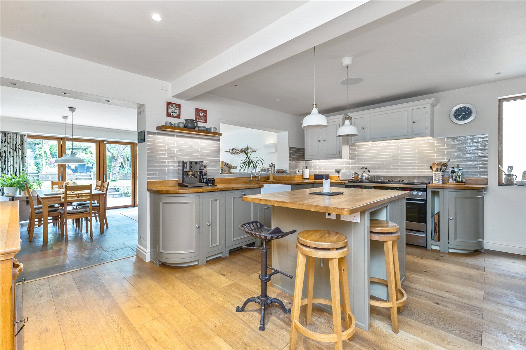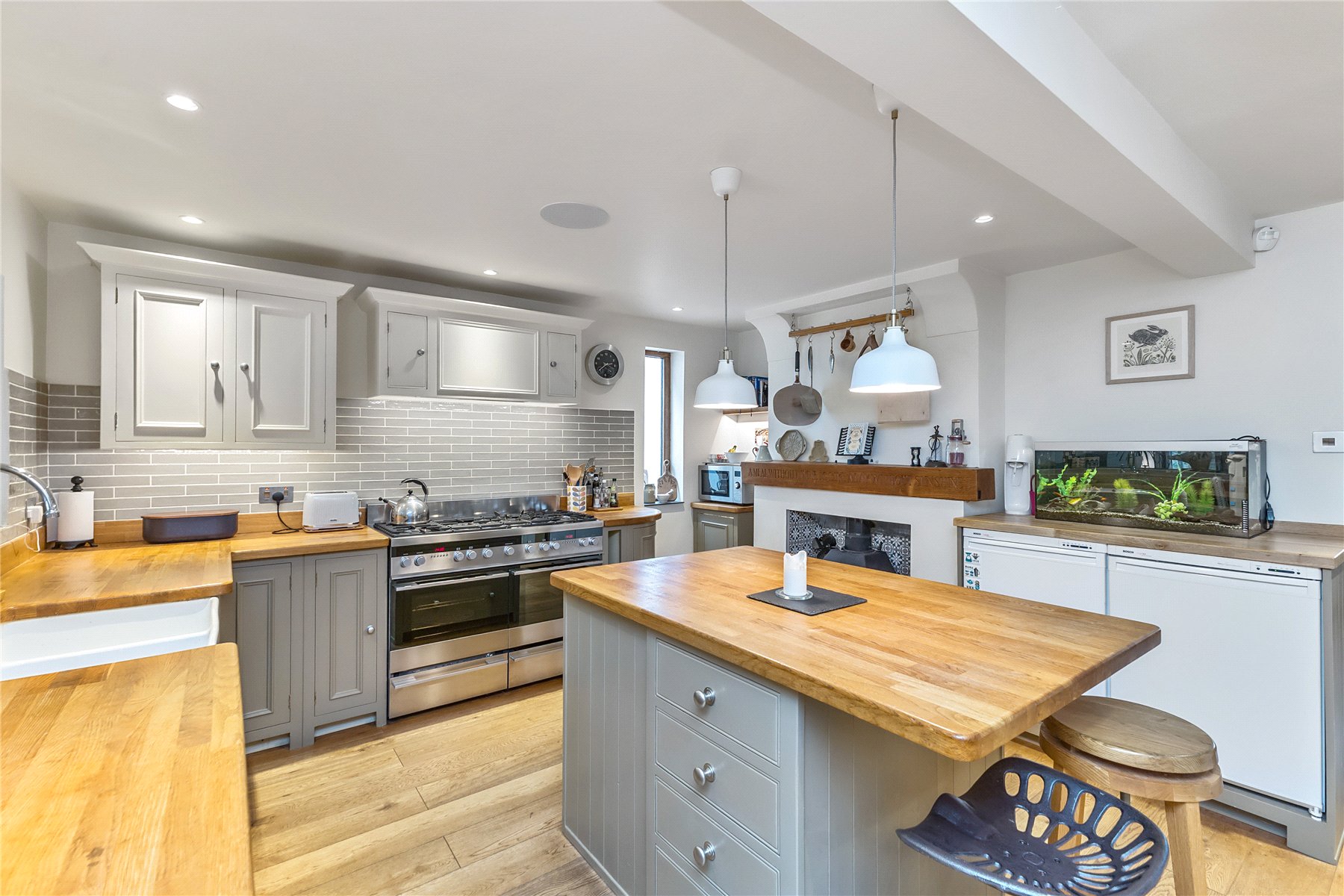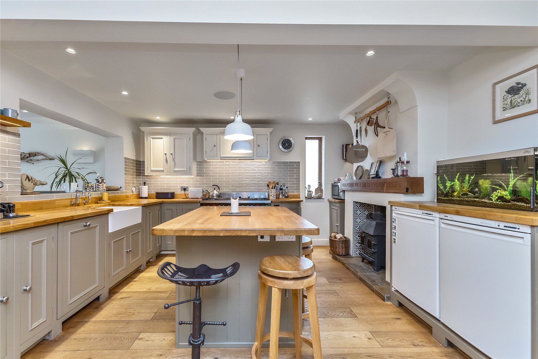 Linking the two reception spaces is superb kitchen; hand craft and installed by Neptune kitchens featuring a large Fisher and Paykel range cooker, butlers sink, central island/breakfast bar and plenty of storage options. A log burning stove evokes memories of cosy farmhouse days baking, cooking and nattering over a warm pot of tea. Completing the ground floor is an all-important cloakroom.
