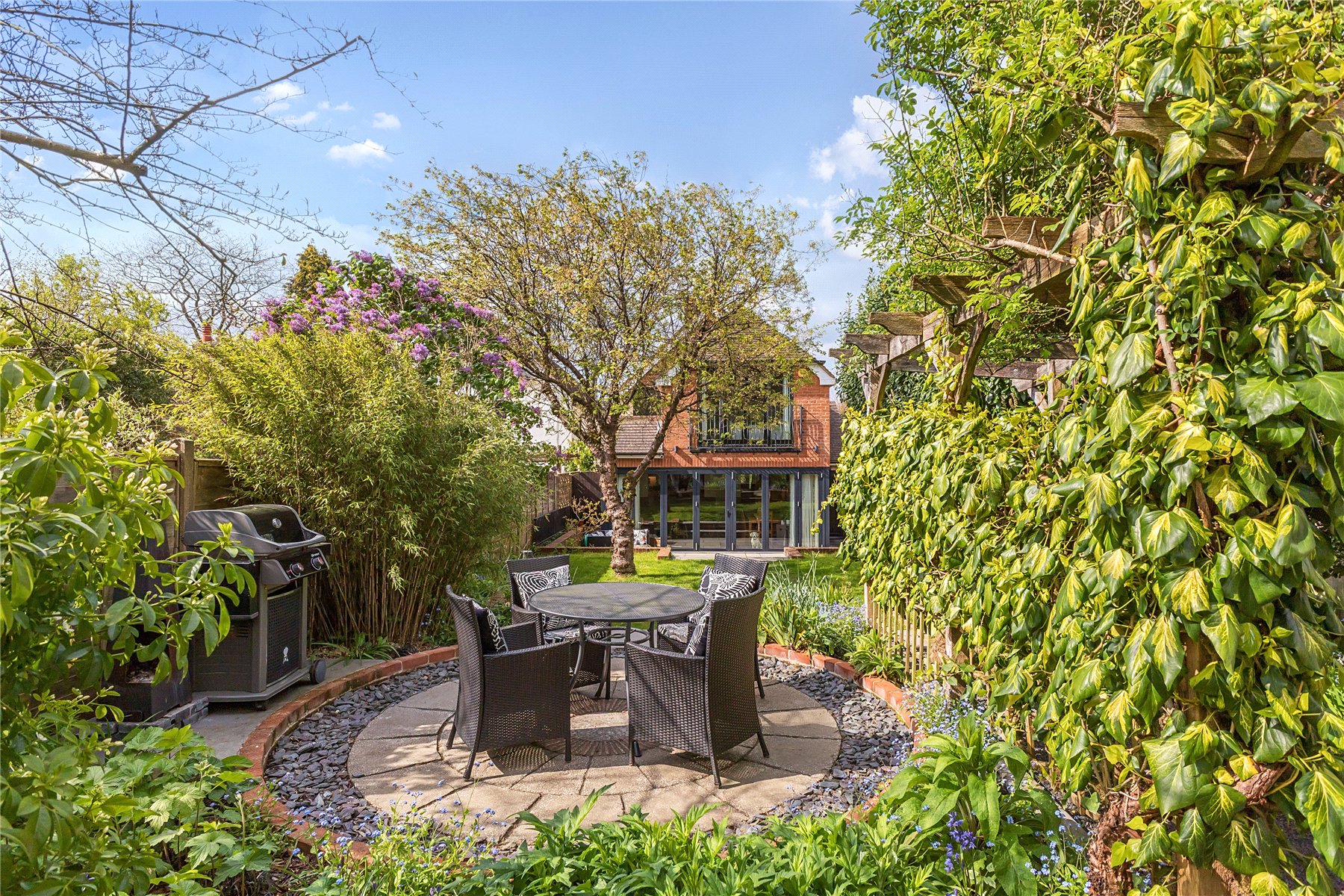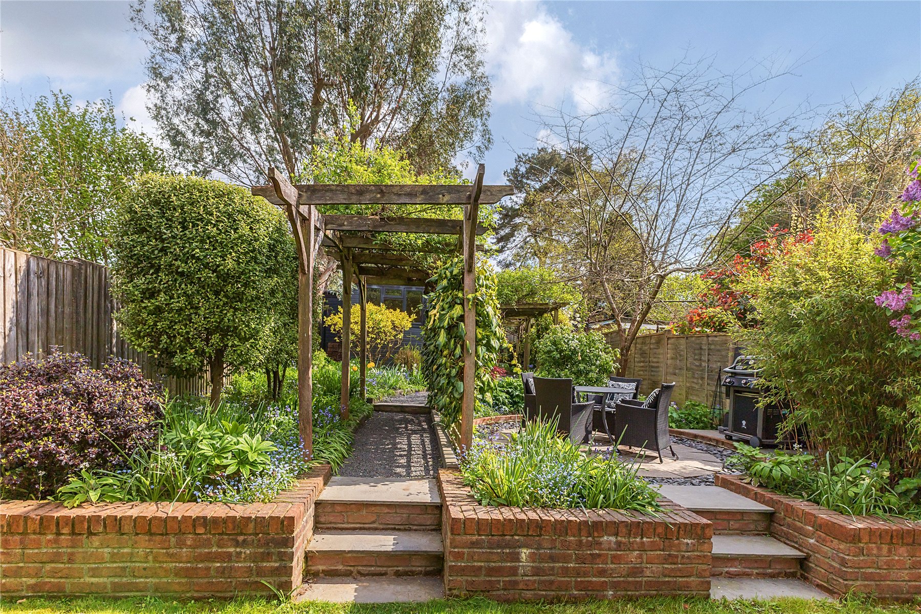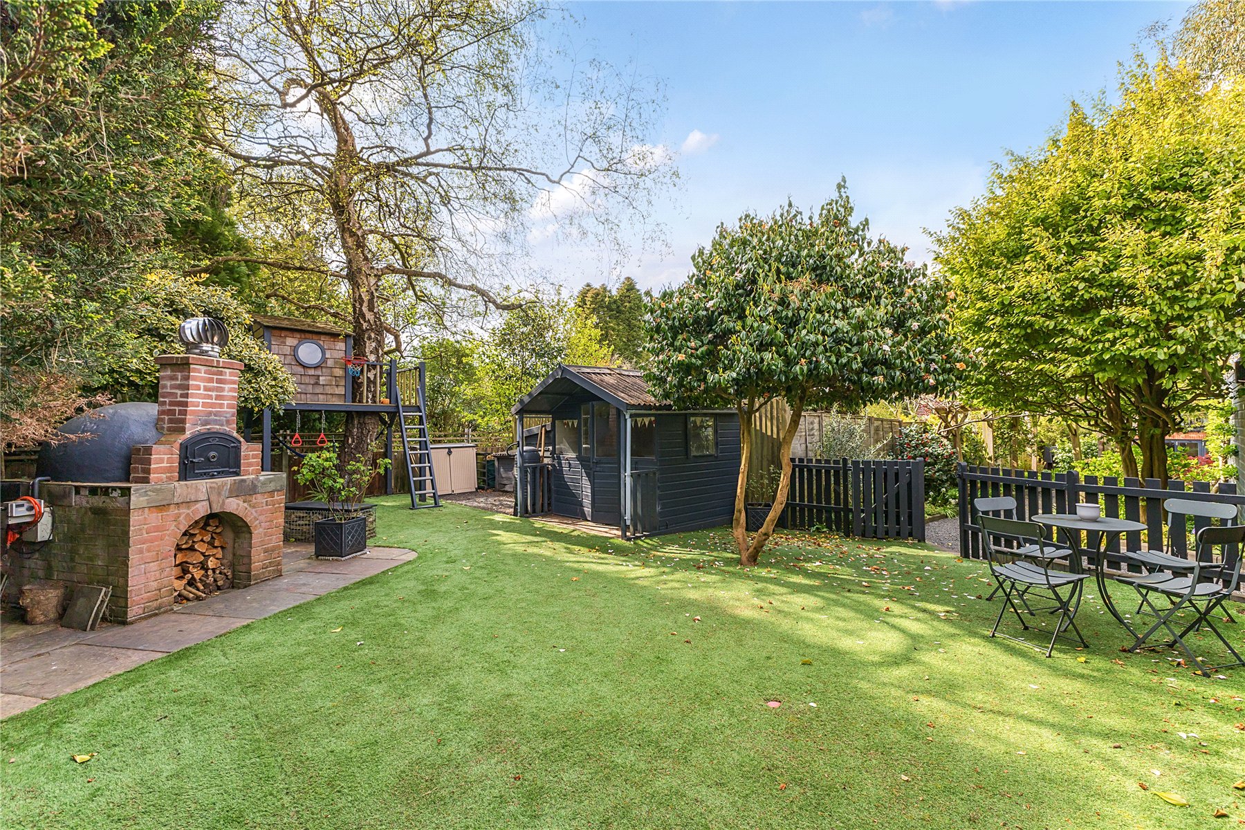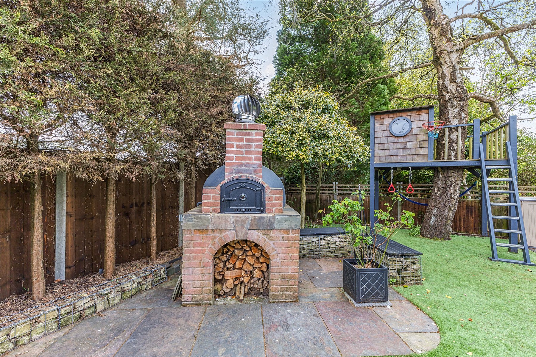 The grounds have been fully landscaped, with an impeccable eye for detail, to maximise their full potential with an area to suit every member of the family, most of which is south facing. Immediately adjacent to the house is a large patio area which is proceeded by a good sized lawn edged by a low retaining wall with two steps up to a feature circular additional patio and a pergola covered pathway (fragrant in Spring thanks to it's trailing white wisteria) up to the garage/workshop/office and upper garden area. There is a side gate onto driveway parking for several vehicles. Beyond this is a hidden garden, a large low maintenance space perfect for entertaining with an Italian hand made pizza oven and summerhouse kitted out as the perfect bar with light, power and fridge. It is fully insulted with a heater so can be used through the year. Completing the scene is a charming treehouse, complete with WiFi connection for a modern hideaway. Flowerbeds and borders are well stocked with mature plants including eating and cooking apple trees.