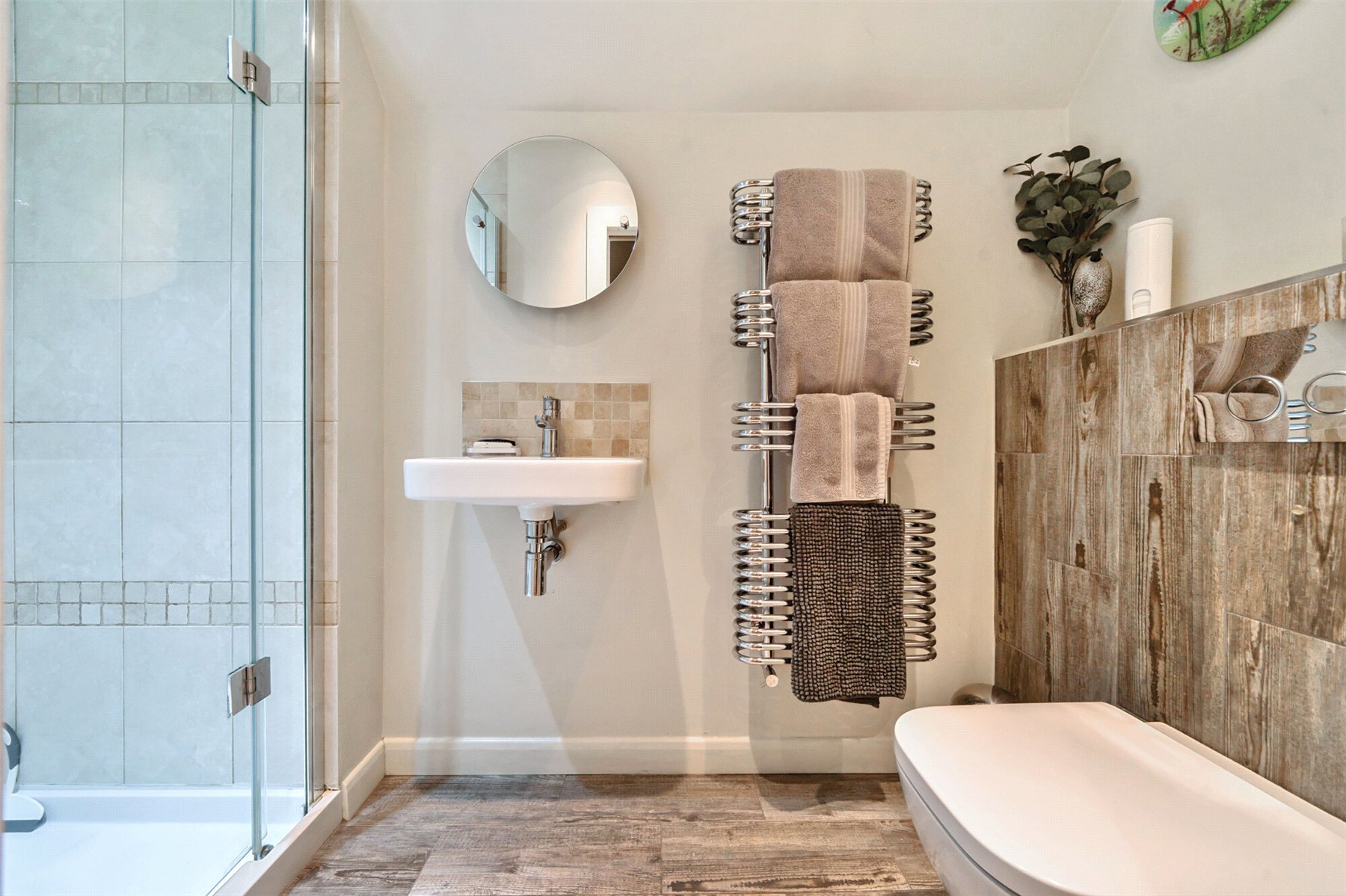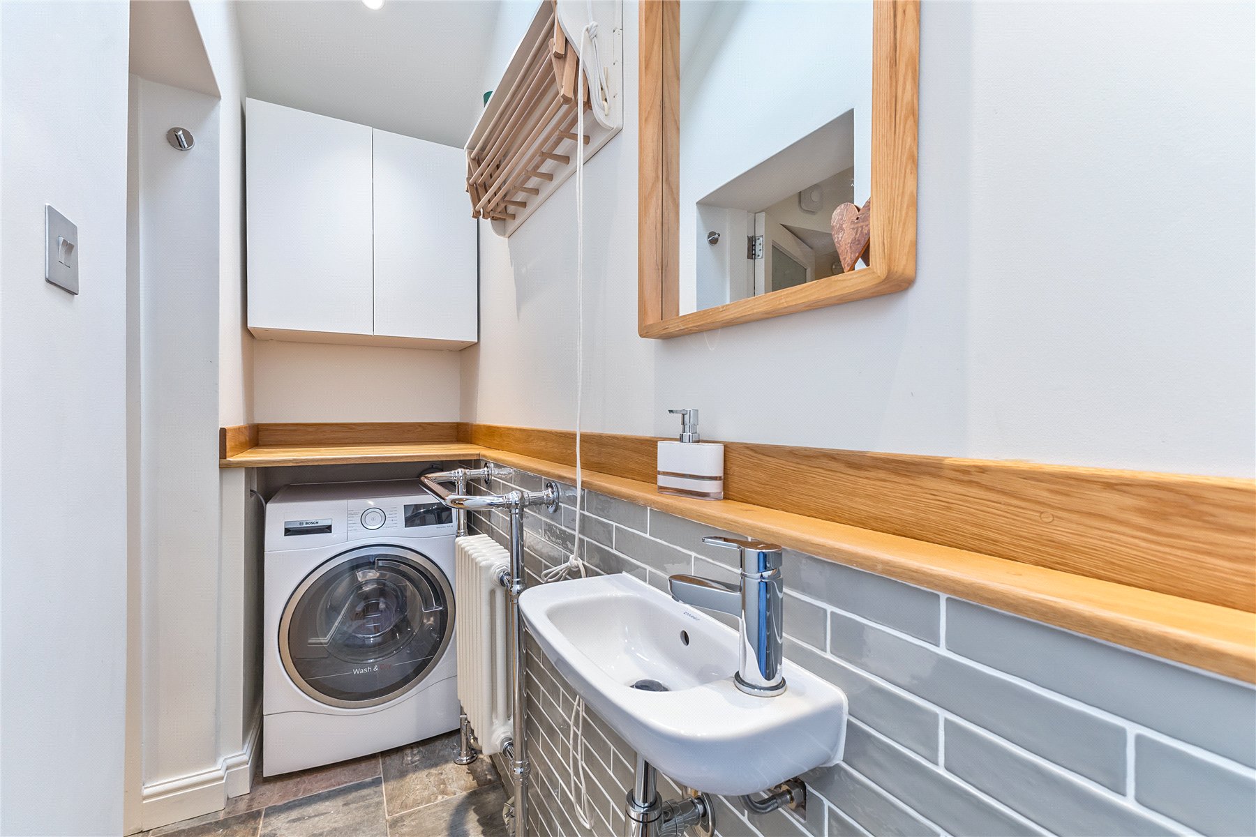 A rear lobby provides a useful spot to hang coats, and the shoe nook has underfloor heating to dry wet and muddy boots.