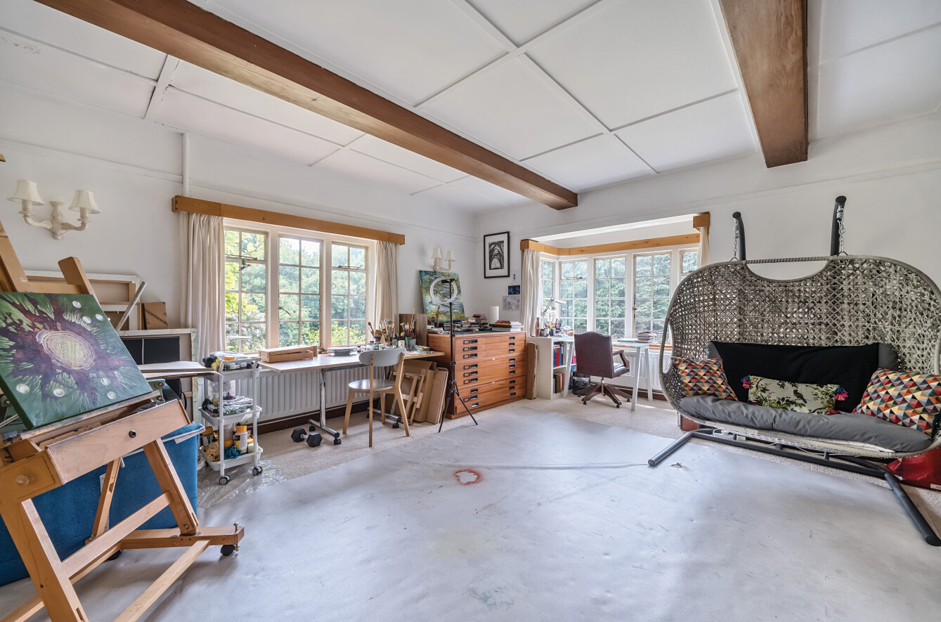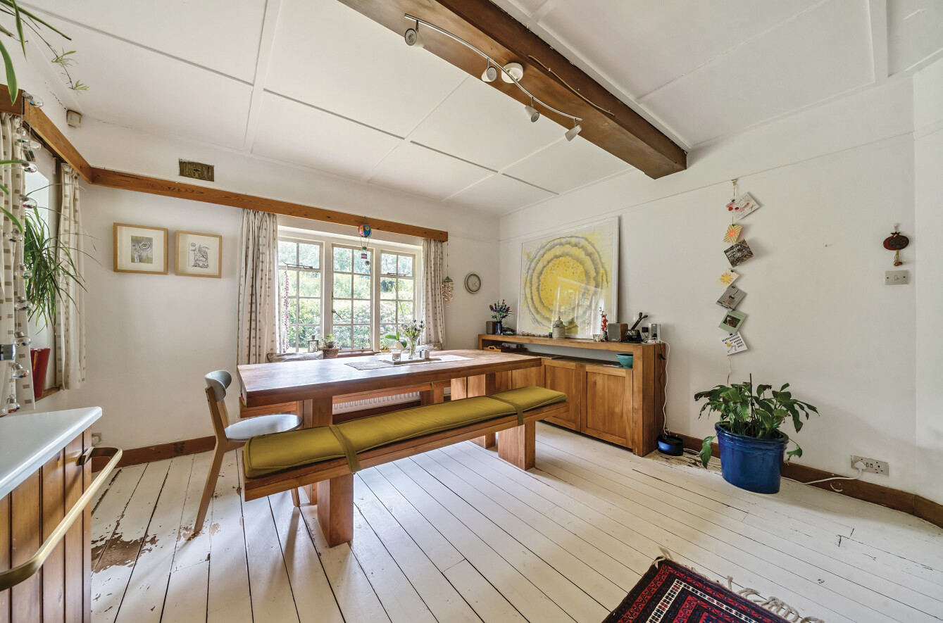 There are several reception rooms offering flexible usage. In it's current configuration we have two large double aspect rooms (a sitting room with brick fireplace and beamed ceiling and a dining room), both of which have south west facing bay windows opening into a sun room which in turn has patio doors opening onto the garden.