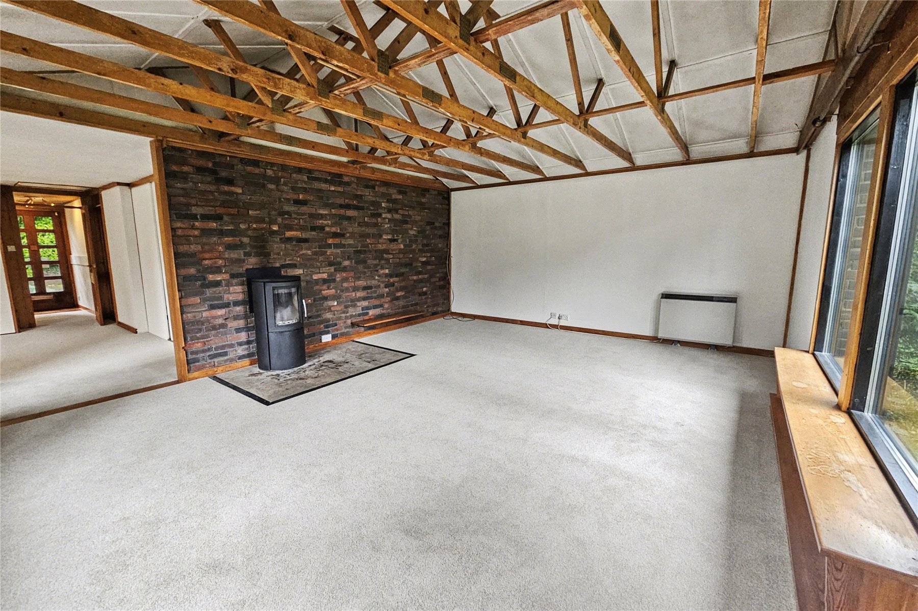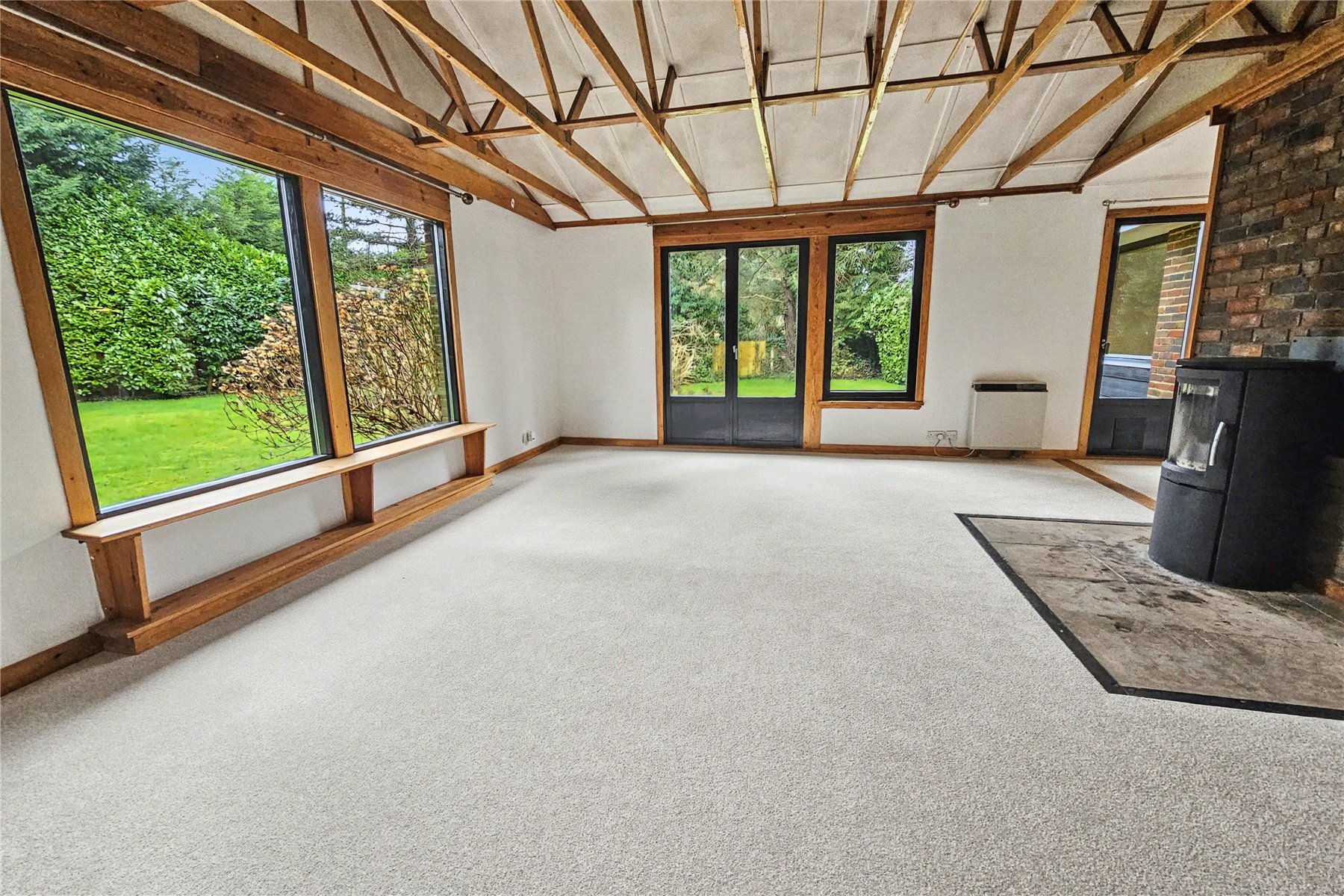 Beyond all of this you come to the sitting room, a generous vaulted and beamed room enjoying southerly views over the garden and west patio doors opening onto the garden. This room is flooded with sunlight throughout the day. There is a feature brick wall with wood burning stove in front, perfect for gathering around on chilly winter days.