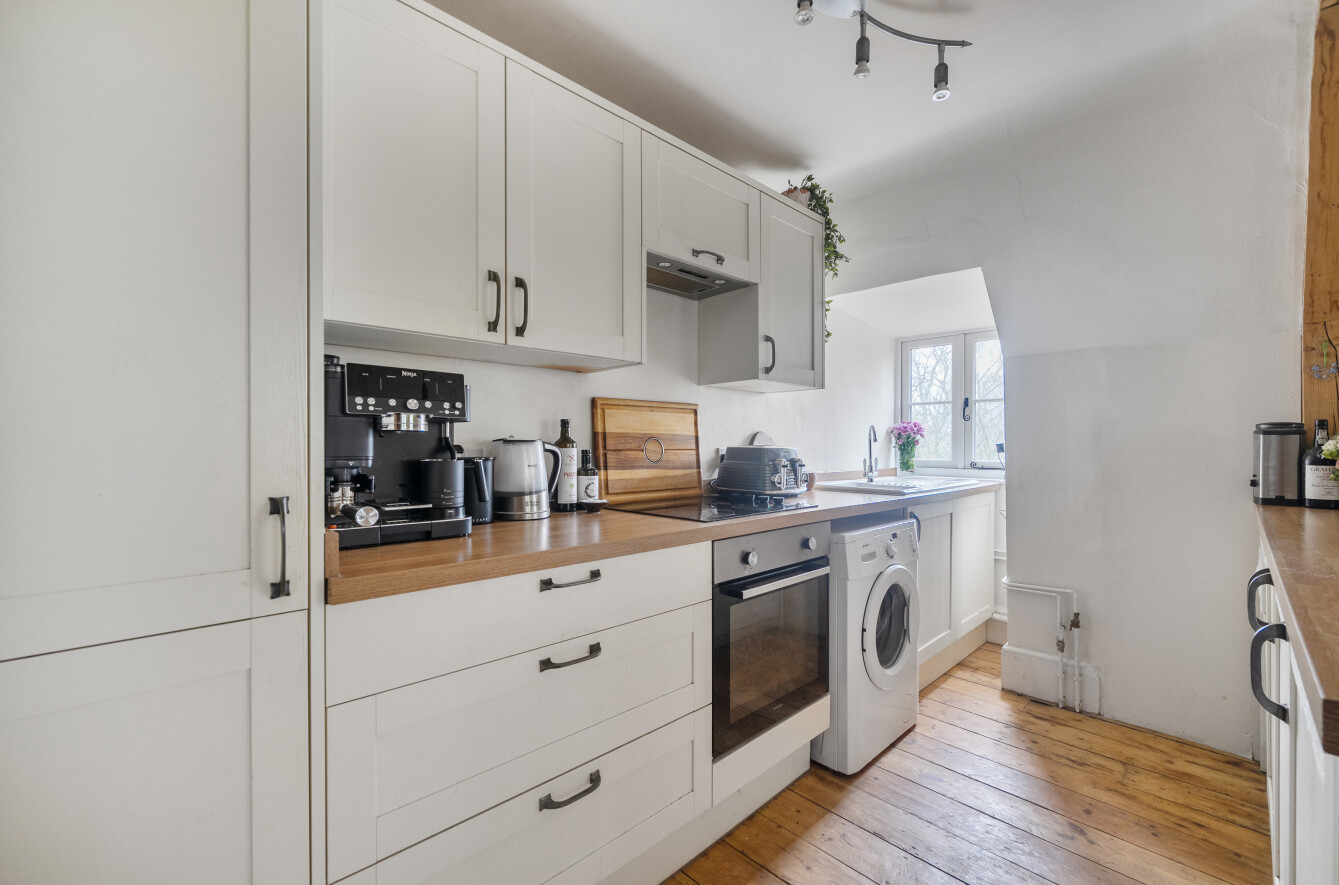 The kitchen is cleverly separated via a good sized breakfast bar. There is a good range of drawer and cupboard storage plus integrated oven and hob, with space and plumbing for a washing machine and fridge