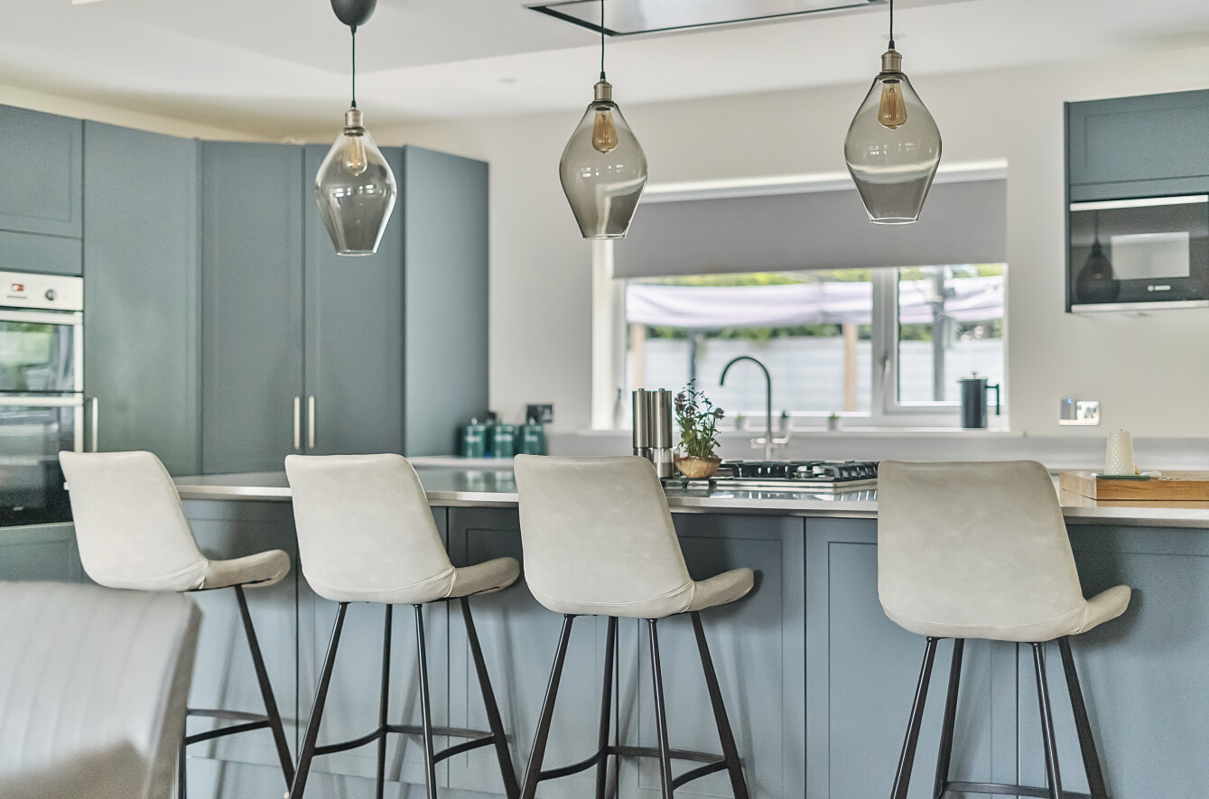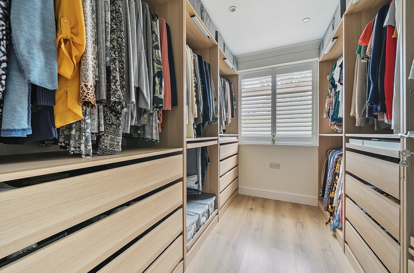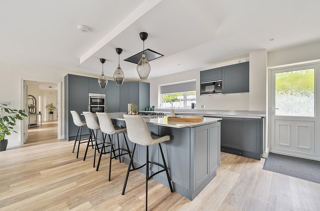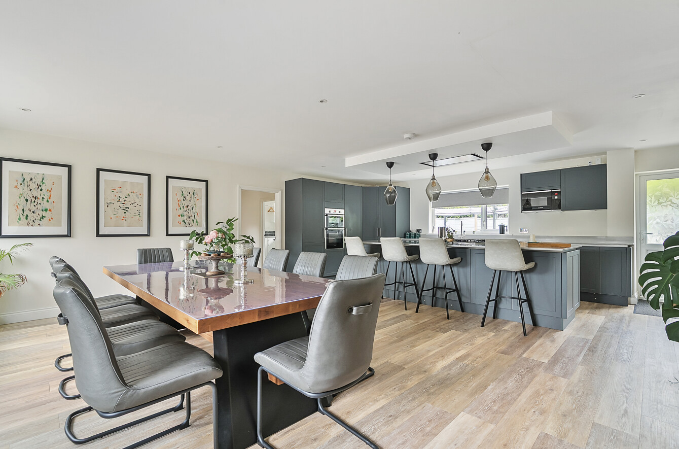 Moving back to the aforementioned sitting room; this is a spacious dual aspect reception space with patio doors onto the garden, great for relaxing or entertaining, but the real heart of the home, where most day to day living will take place is a superb L -shaped kitchen/dining/family room. Again benefitting from a bright and sunny double aspect, running the full depth of the property this room extends to 33'11 x 25'4. There is plenty of space for dining furniture and well as a lounge area, and has access onto the rear garden. The kitchen offers everything an aspiring chef, or busy family may need! Fitted with an extensive range of storage, with cupboards, deep drawers and a walk in pantry. Of note is the extensive central island which extends into a breakfast bar, but there are also several feature items such as double sink with hot water tap, and integrated appliances including 2 electric ovens, microwave, gas hob, dishwasher, fridge freezer and bin store.