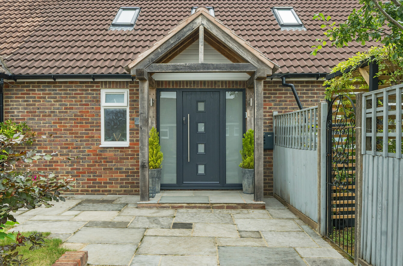 To the far left hand side is a sizeable driveway offering parking for some 4-6 cars. A paved pathway opens into a wide terrace by the front door; with an attractive Oak framed entrance porch sitting above a modern UPVc front door.