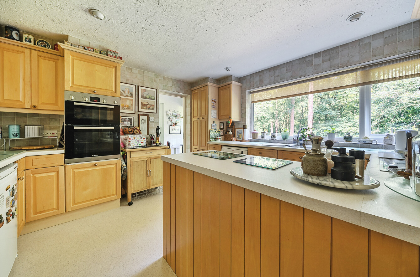 The house sits at the end of a quiet cul de sac backing onto woodland within generous gardens of 0.4 acres. Lawned front garden interspersed with mature trees and shrubs with driveway parking to the side leading to an integral double garage.