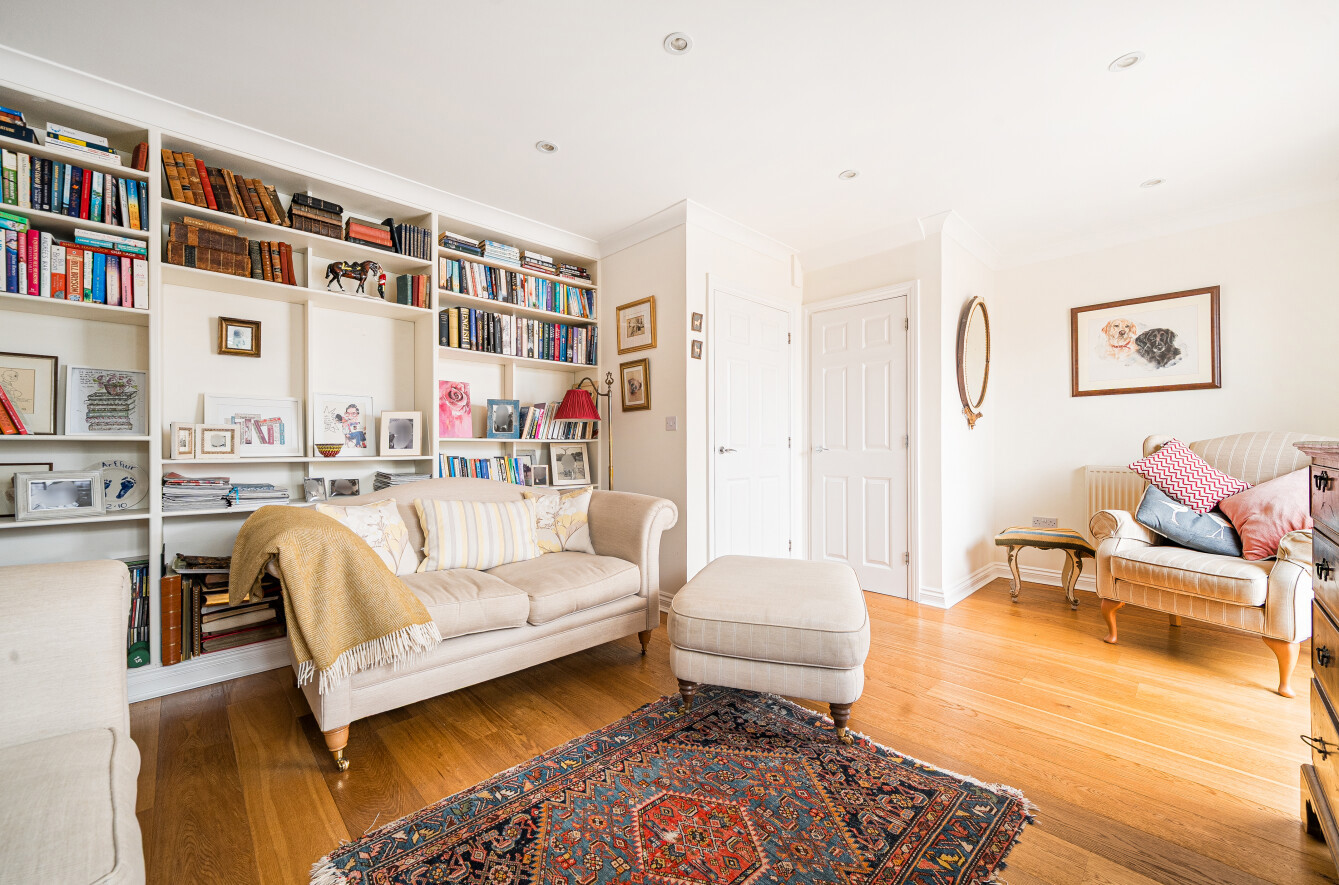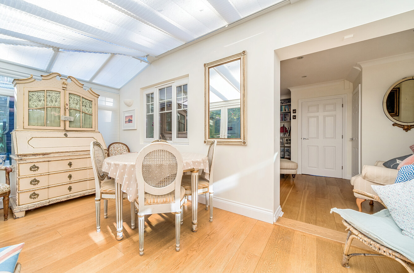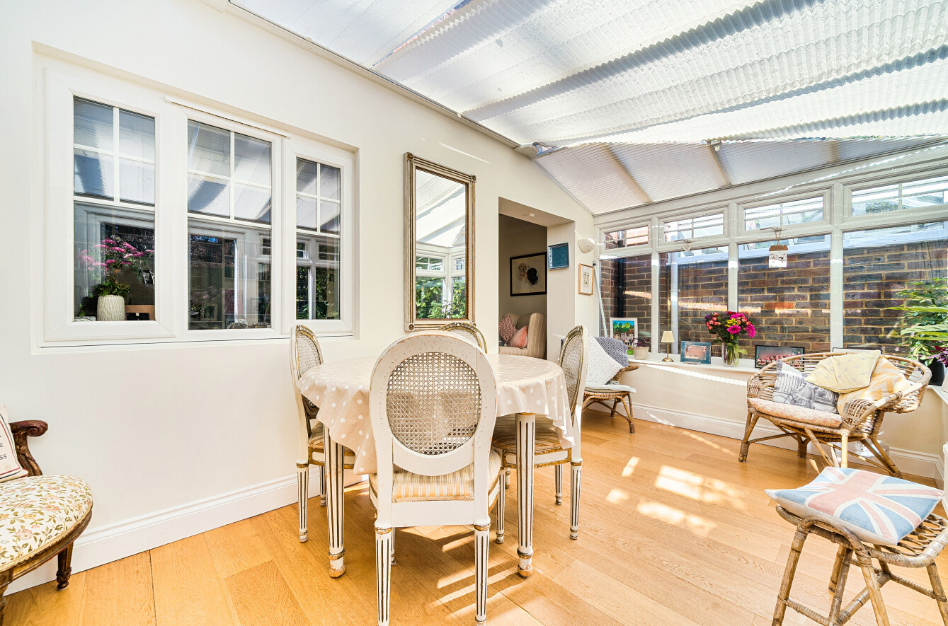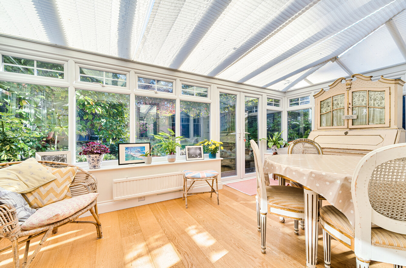 The sitting room has a large built in shelving unit along one wall and a wide opening into a conservatory extension which serves as a dining room, but the usage of these could be swapped, with this room enjoying delightful views over the garden