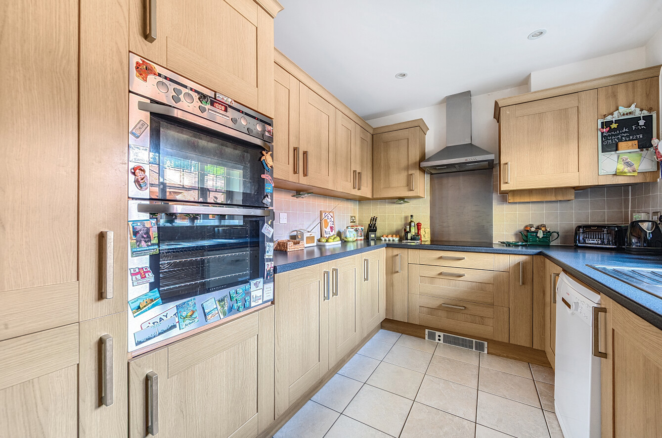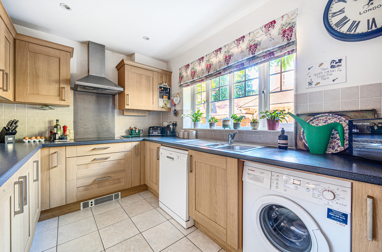 To the right, overlooking the front, is the kitchen which benefits from a range of drawer and cupboard storage in addition to integrated electric hob, double oven and fridge freezer with further space and plumbing for a washing machine and dishwasher