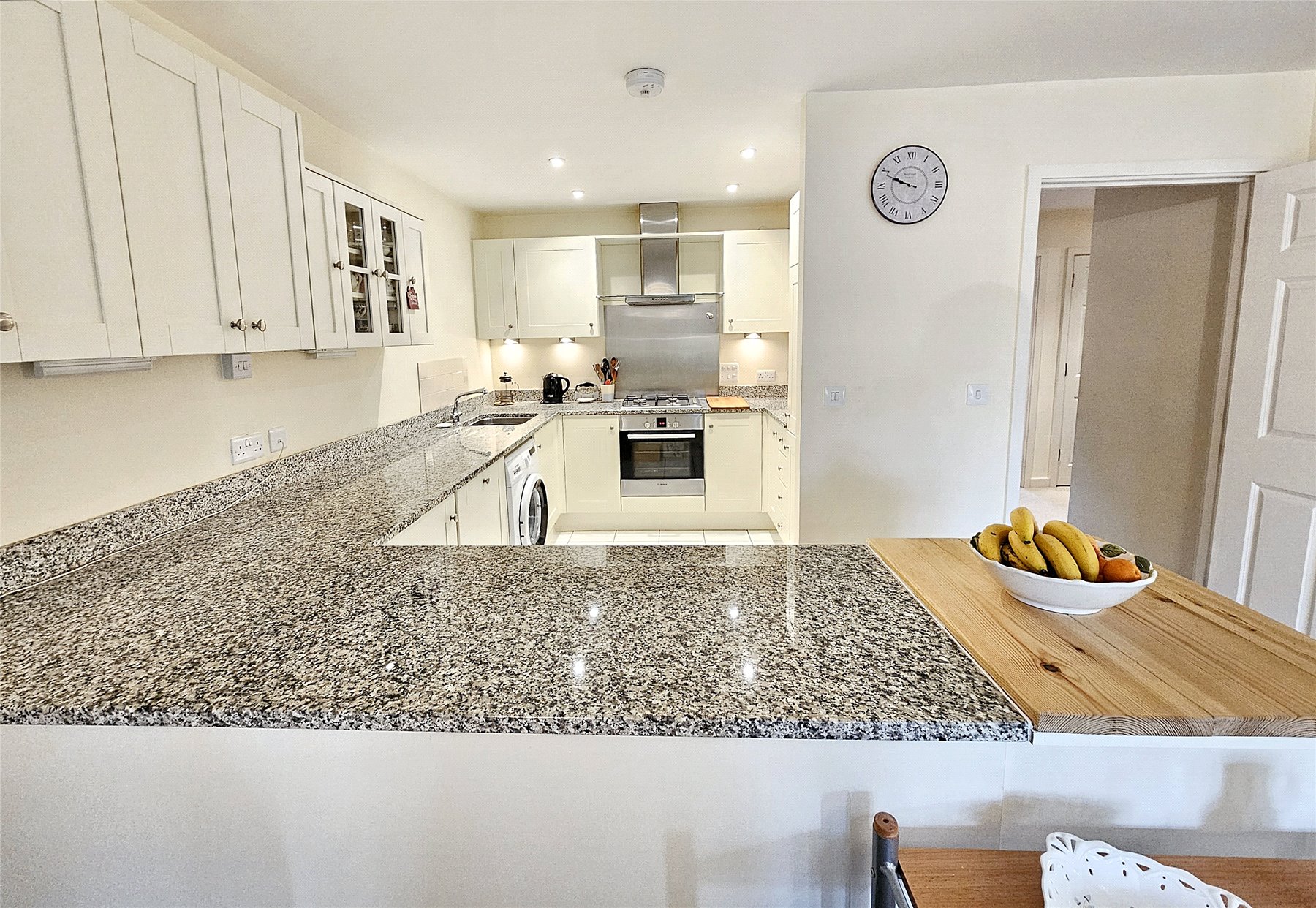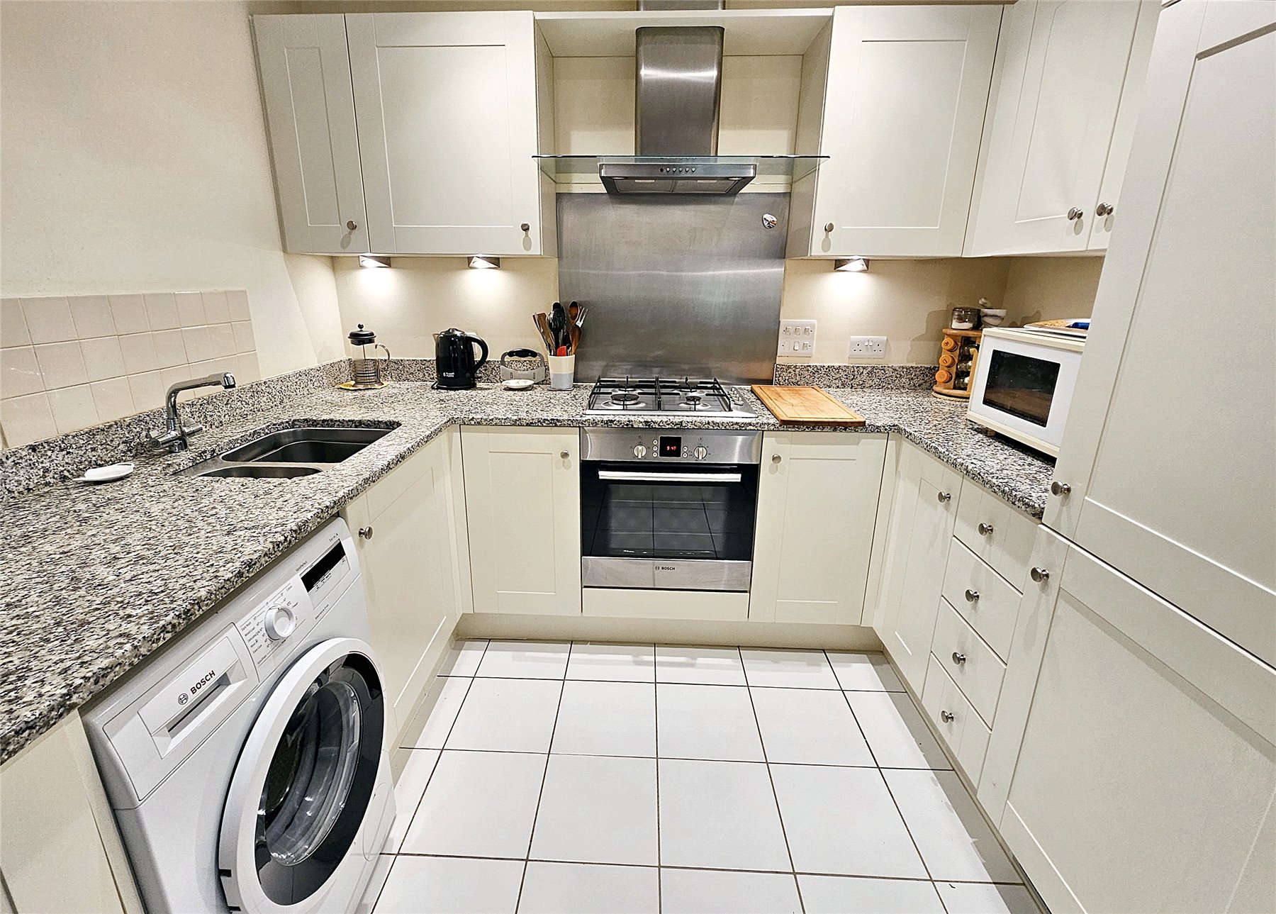 A private front door open into a generous hallway with storage cupboards. To one side of the apartment is your reception space, this is a large open plan sitting/dining room with patio doors onto a Juliette balcony and communal gardens beyond. A breakfast bar separates this space from the kitchen which is modern and well equipped with extensive work tops, drawer and cupboard storage, and integrated appliances.