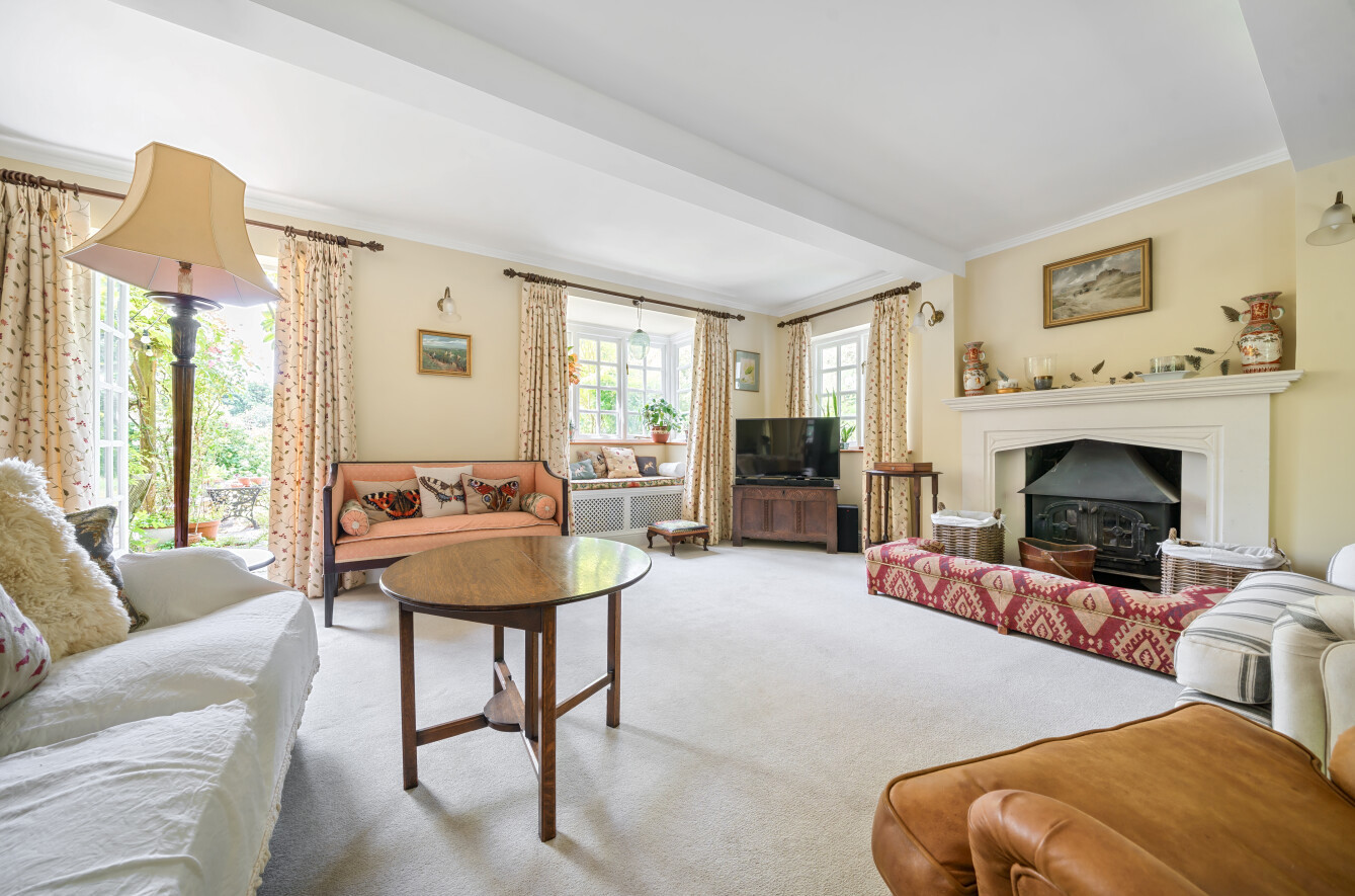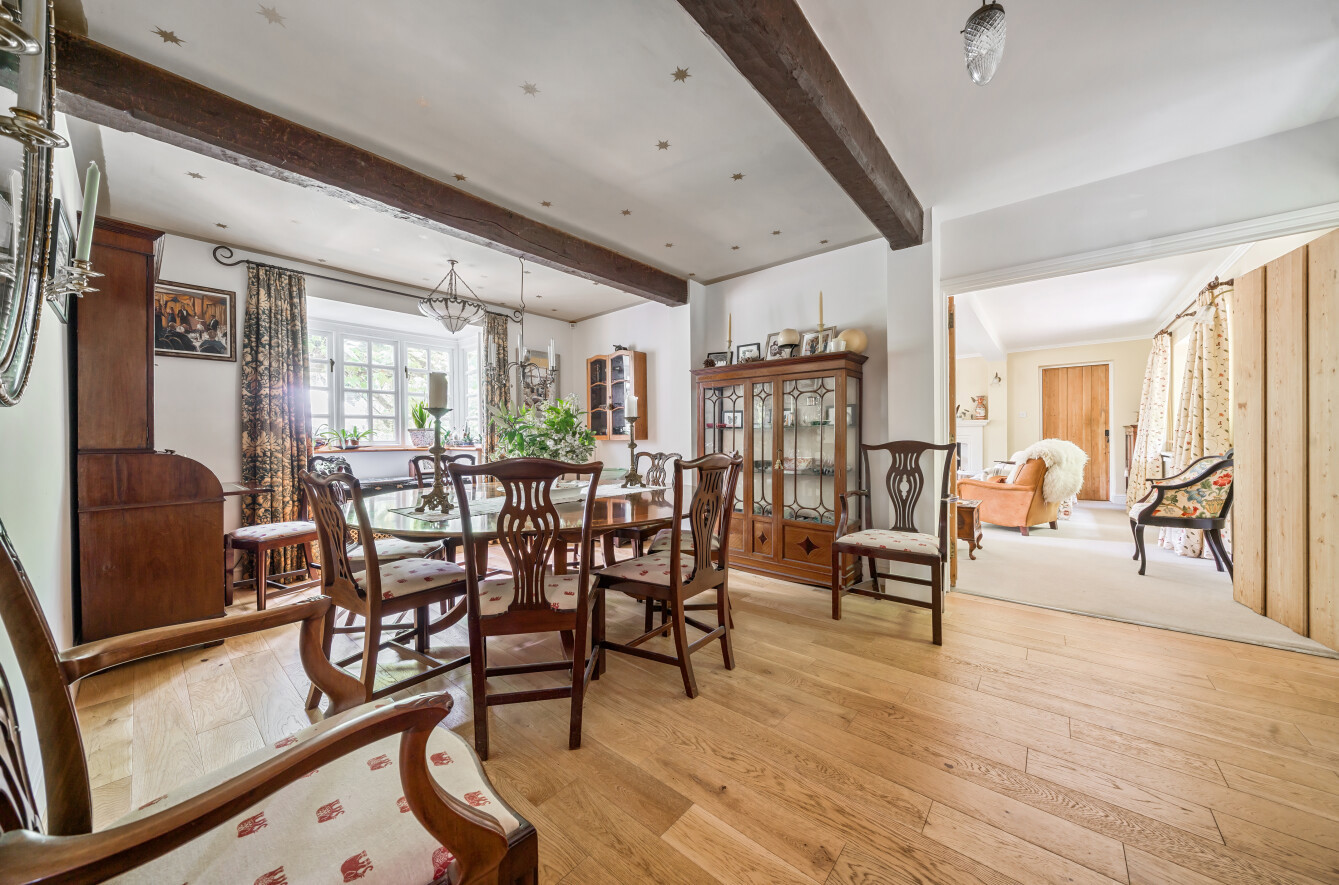 The dining room is the perfect space for family meals and dinner parties with space for a large dining table. A bay window frames a view across the garden. The wood floors lead to a wonderfully spacious sitting room filled with natural light. With French doors leading out to the garden, the large triple aspect sitting room is a homely space to relax and unwind, while a classic wood burner within an elegant fireplace adds a refined focal point.