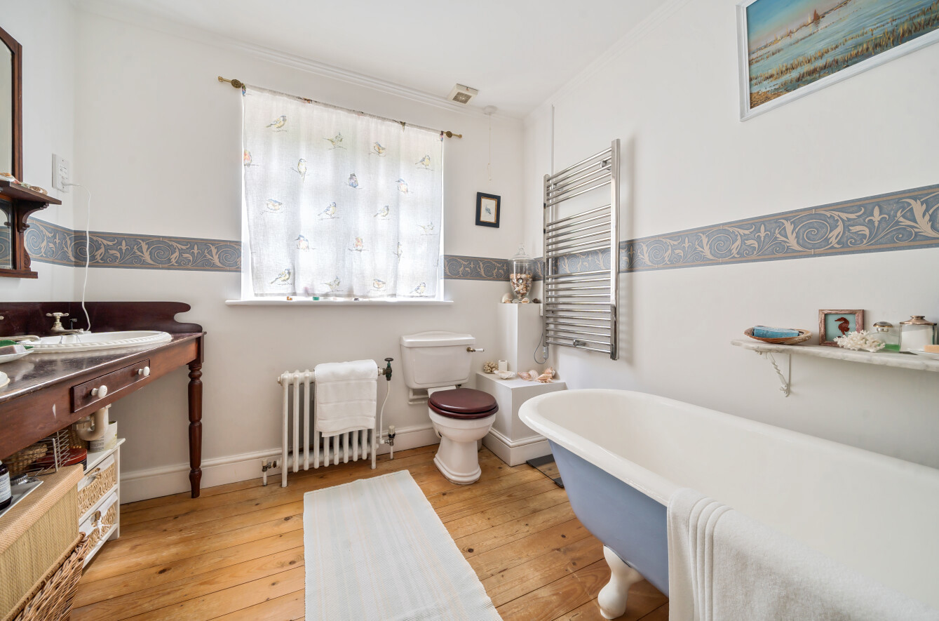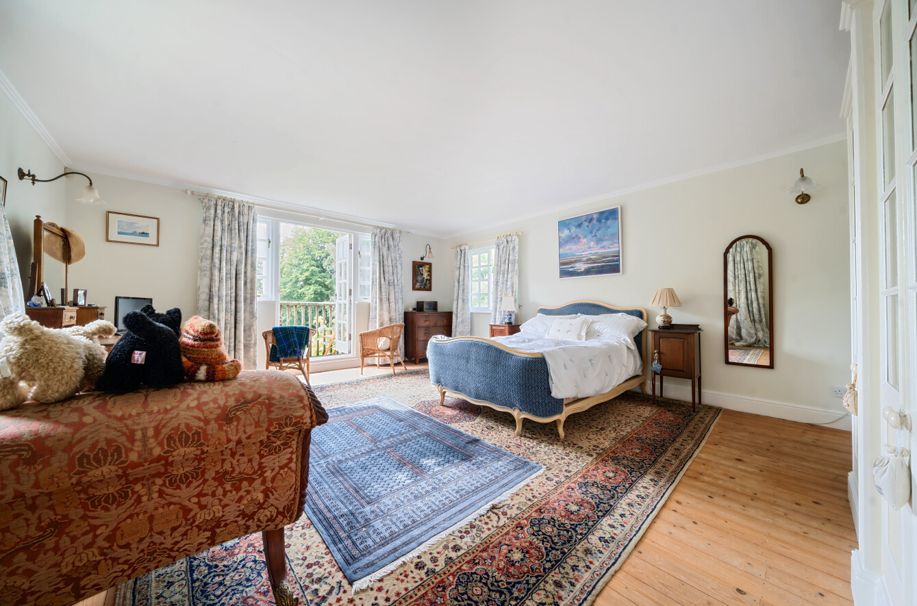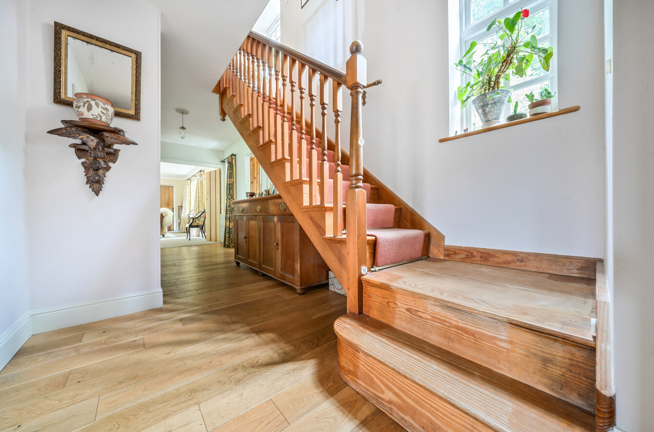 The leafy vistas continue upstairs where a light principal bedroom suite stretches out across the full width of the house and with its private balcony overlooking the grounds creates a calming retreat. Fitted wardrobes provide plenty of storage and a notable ensuite. Along the hallway three additional double bedrooms all with built in wardrobes, one with its own ensuite shower room, while the others share a modern family bathroom.
