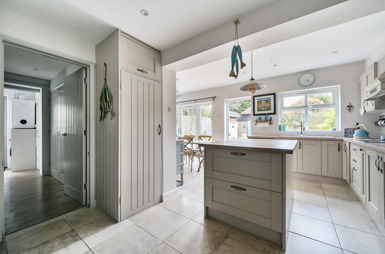 Adjoining the kitchen is a separate utility room, providing valuable additional storage, a larder and coat cupboard. It also provides access to a downstairs WC. The property also benefits from an integrated garage, currently used as storage but with exciting potential to be converted into a home office, gym, or an additional reception/playroom, subject to the usual consents.