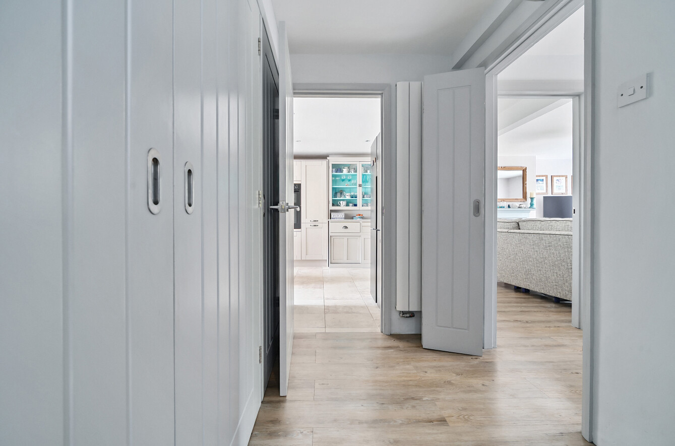 Upstairs, the accommodation continues to impress with three generously sized double bedrooms, all well-presented and full of natural light. The principal bedroom includes a range of fitted wardrobes and a recently upgraded en suite shower room featuring contemporary tiling, premium fixtures, and a sleek, modern finish. Bedrooms two and three are equally spacious and are served by a beautifully appointed family bathroom. This luxurious space includes a full-sized bathtub, a separate walk-in shower, basin, and WC, all finished to a high standard.