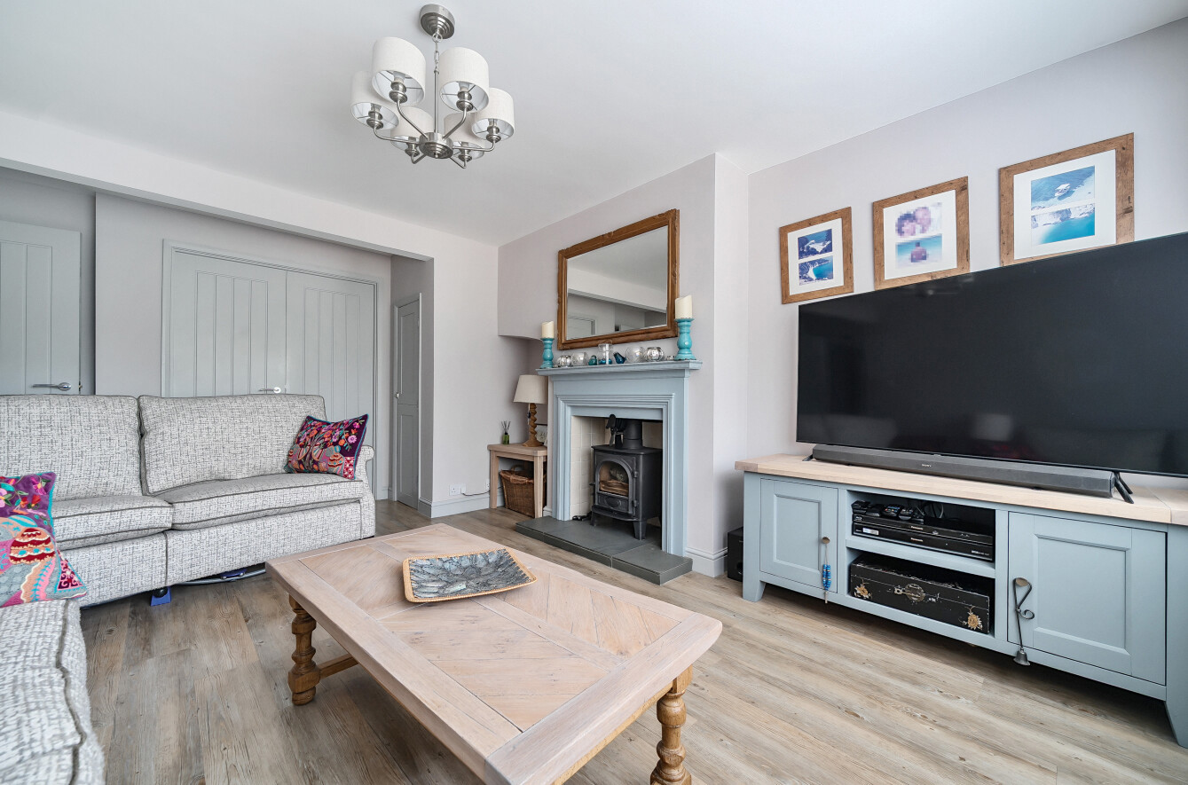 Upon entering the property, a spacious and airy entrance hall provides a great sense of flow and space. To the front, the beautifully proportioned living room is bathed in natural light from a large front aspect window. A feature fireplace, complete with a wood-burning stove, adds charm and warmthmaking this a cosy retreat during the cooler months.