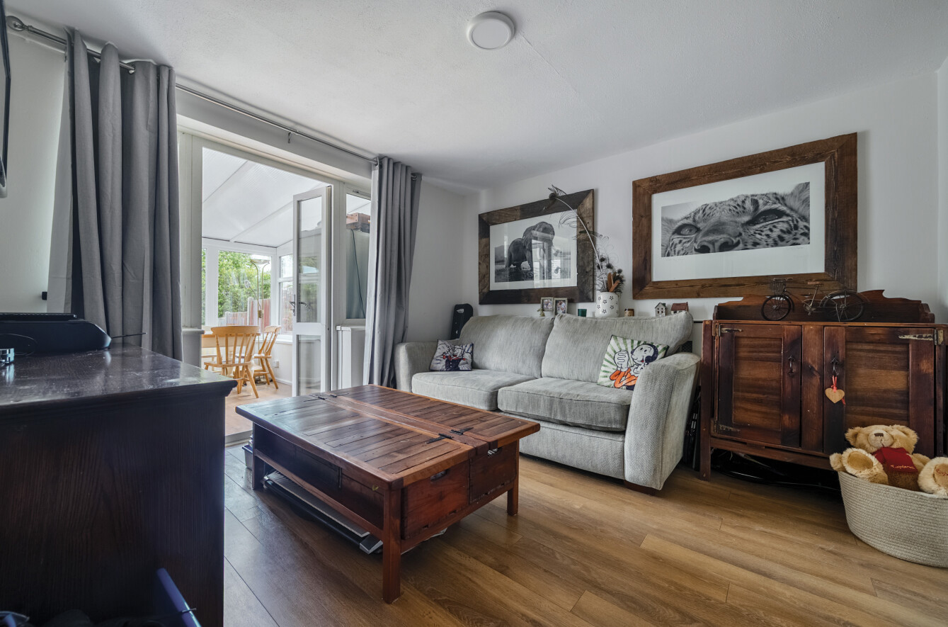Inside, the accommodation comprises two well-sized double bedrooms and a welcoming sitting room featuring a fireplace, which opens into a conservatoryperfectly suited as a dining area or additional living space. The modern kitchen is fitted with base level units, an integrated hob and oven, and benefits from a modern boiler. A bathroom with white suite and pedestal basin sits alongside a separate WC, while two large storage cupboards are located in the entrance hall.