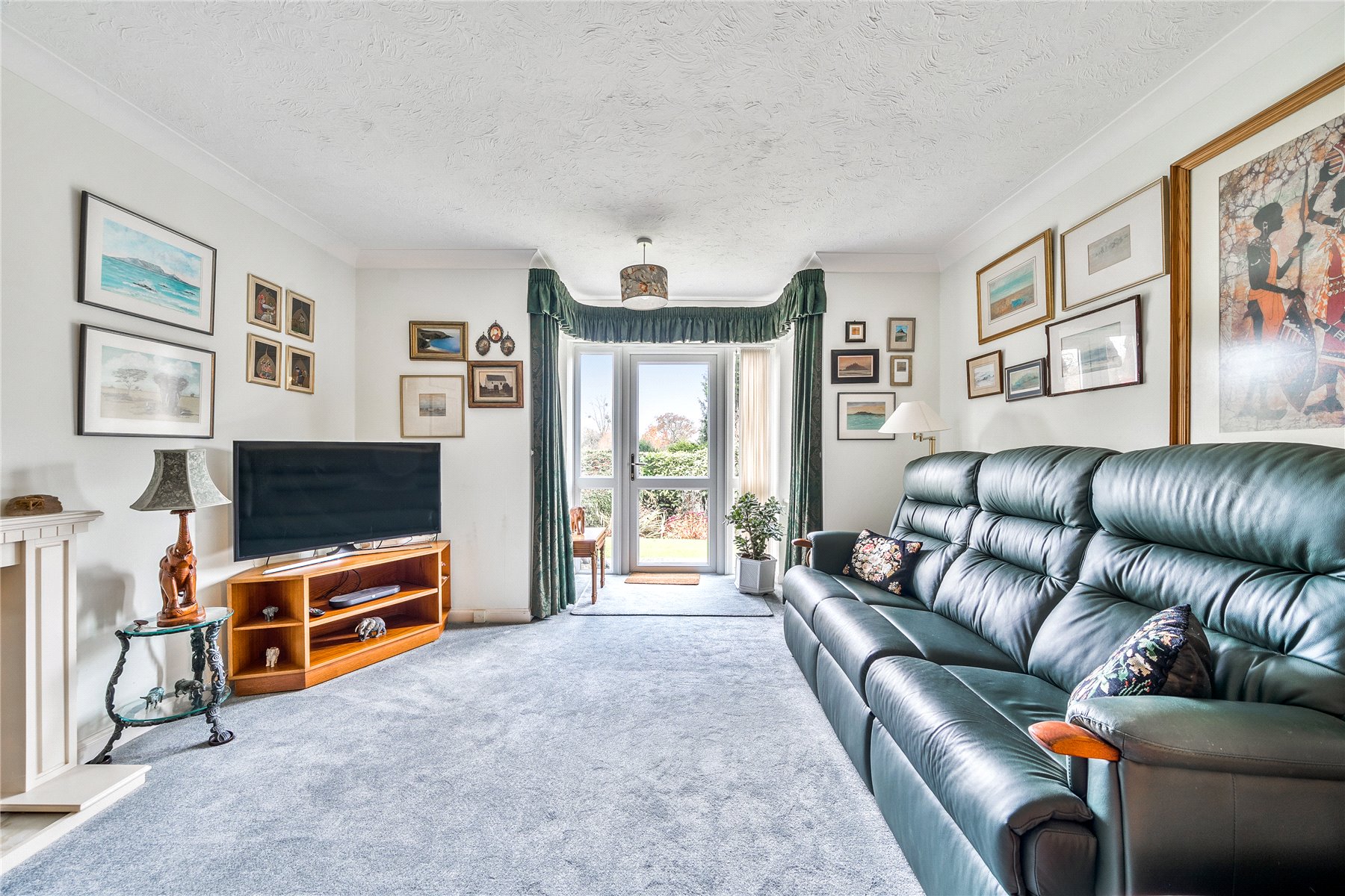 The apartment features a bright and airy, newly-fitted kitchen at the front, further beneffiting from convenient, additional storage area. The spacious living room, enhanced by French doors, opens directly onto the beautifully maintained communal gardens, allowing an abundance of natural light and creating a seamless indoor-outdoor connection.