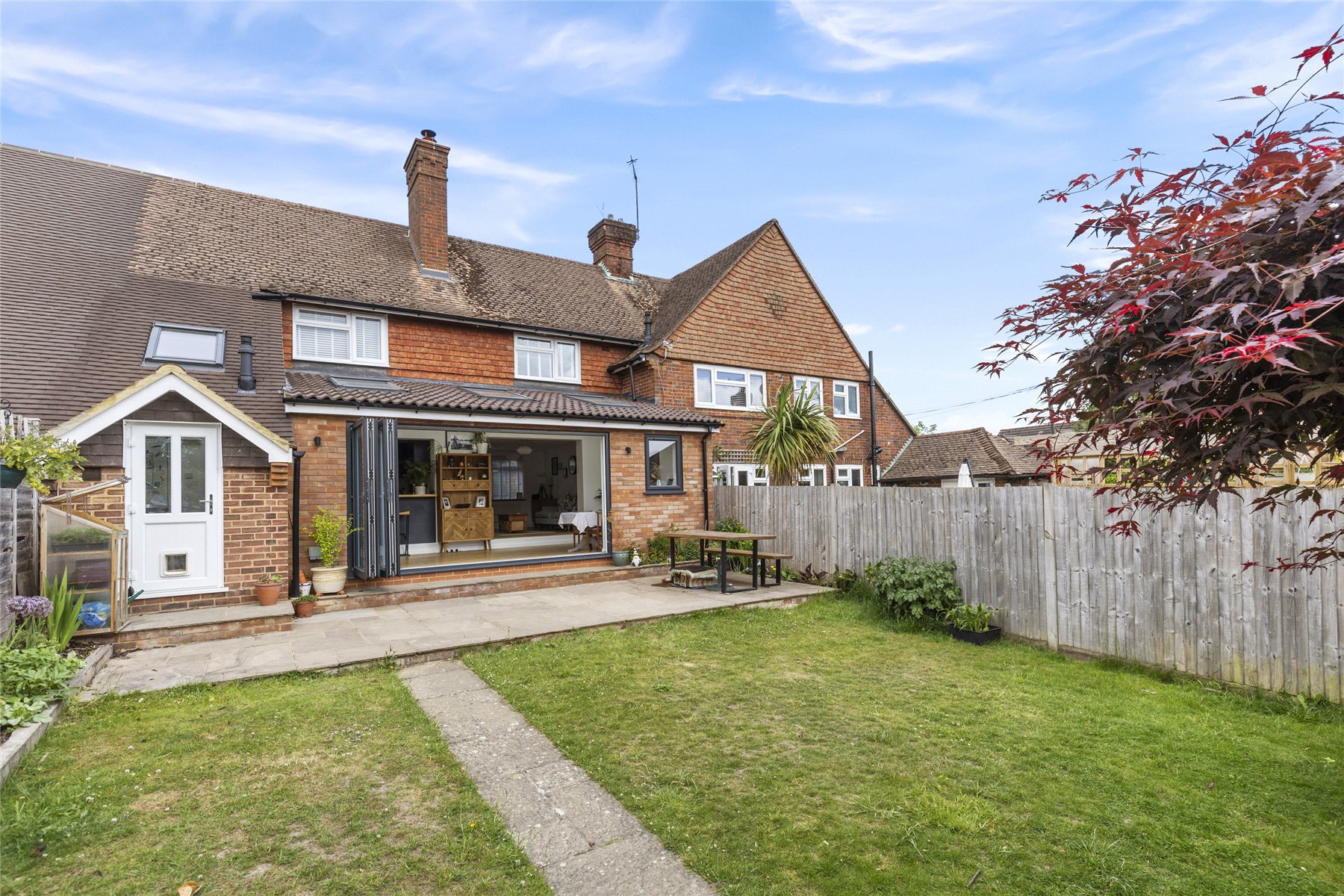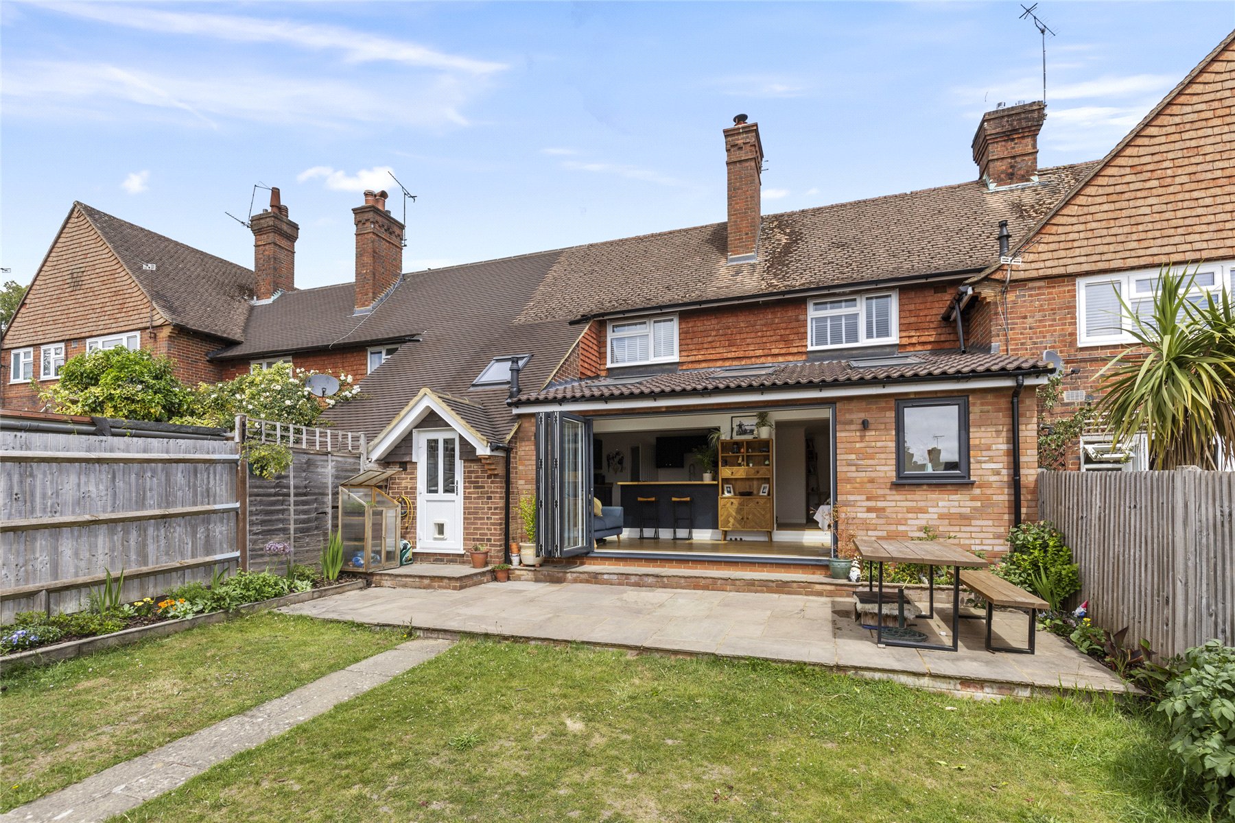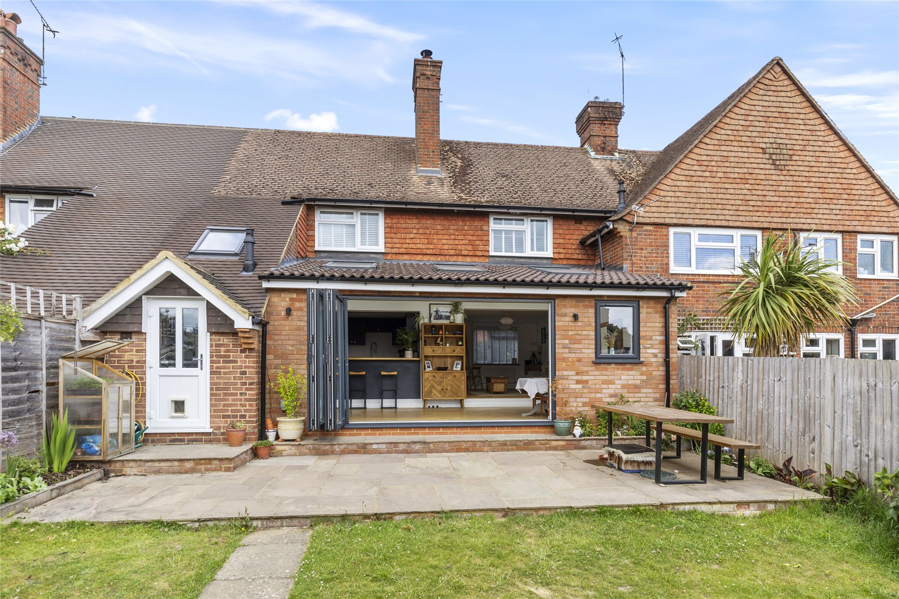 Having been thoughtfully renovated in recent years and skilfully extended, this mid-terraced home is presented in immaculate condition, both inside and out a property sure to appeal to discerning buyers with an eye for style. Its charming cottage-style frontage immediately captivates, inviting you through the oak front door into a home that exudes calm, balance, and careful design.The welcoming sitting room features a generous front window and a partially open-plan layout, allowing natural light to pour through the space and create a bright, uplifting atmosphere throughout the year.At the heart of the home lies the impressive kitchen and entertaining area a spacious and versatile hub designed for modern living. Whether preparing meals, dining with friends, or relaxing with family, this beautifully arranged space adapts effortlessly to every occasion. Bi-fold doors seamlessly connect indoors and outdoors, while the deep navy tones add a sophisticated, contemporary character that feels both elegant and inviting.Upstairs, there are three well-proportioned double bedrooms, each bright and comfortable, offering practical living space along with built-in storage in every room. The bathroom has been carefully designed to make the most of the available space, finished in soft grey and white tones to create a calm and relaxing environment, ideal for both busy mornings and unwinding at the end of the day.