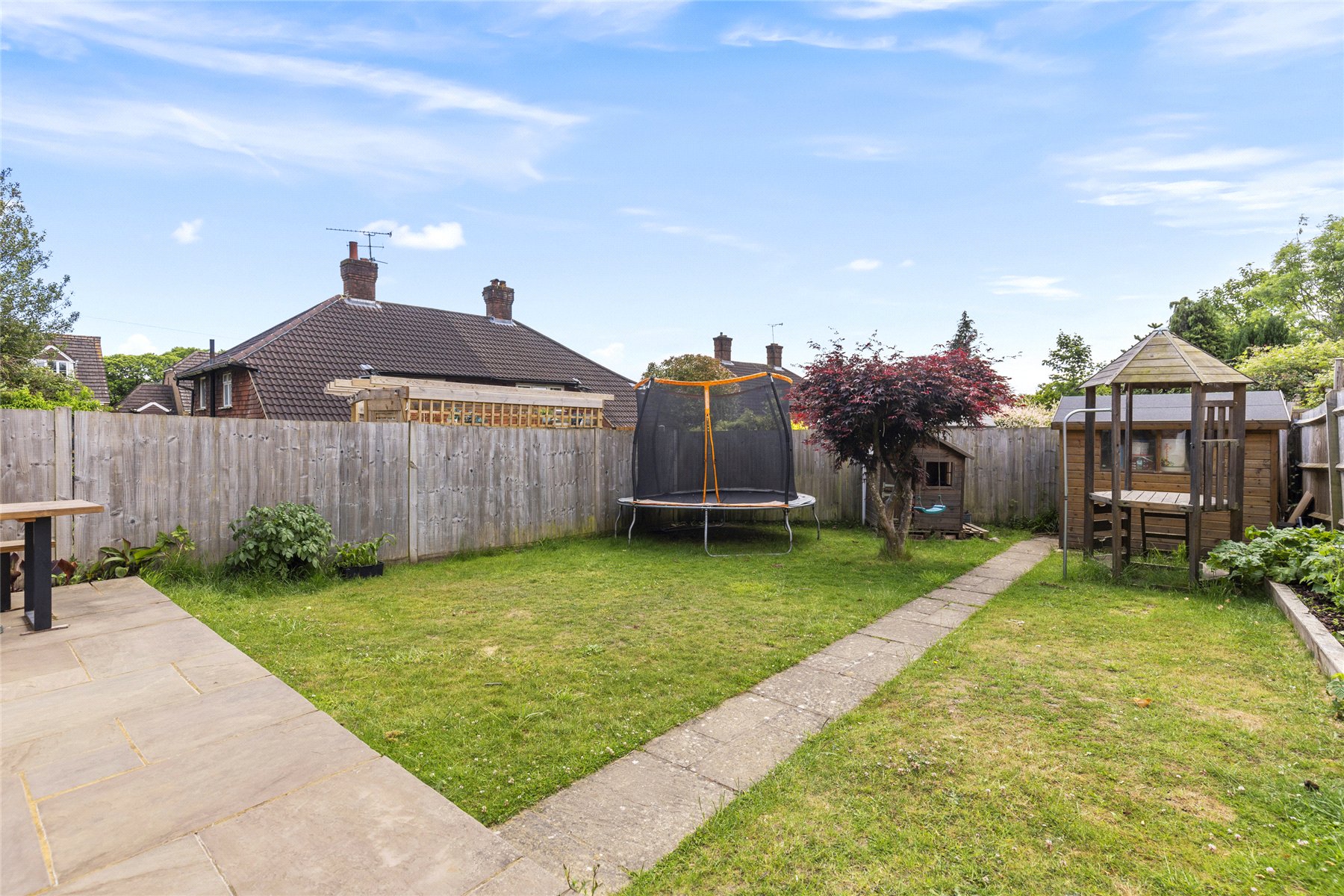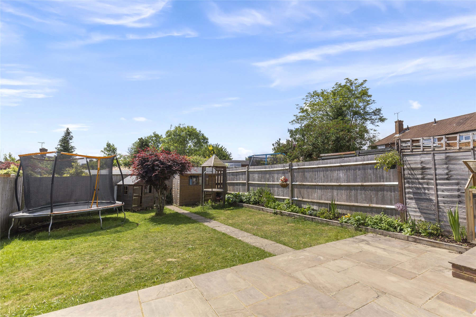 The rear garden is mainly laid to lawn, offering a generous and family-friendly outdoor space ideal for both relaxing and entertaining. A paved patio area provides the perfect spot for outdoor dining and summer gatherings, while the lawn is complemented by well-stocked planted borders adding colour and interest throughout the seasons.A pathway leads to the rear of the garden where a useful garden shed provides additional storage, and there is ample space for children's play equipment. The garden is fully enclosed with fencing, creating a private and secure environment suitable for families and pets alike.