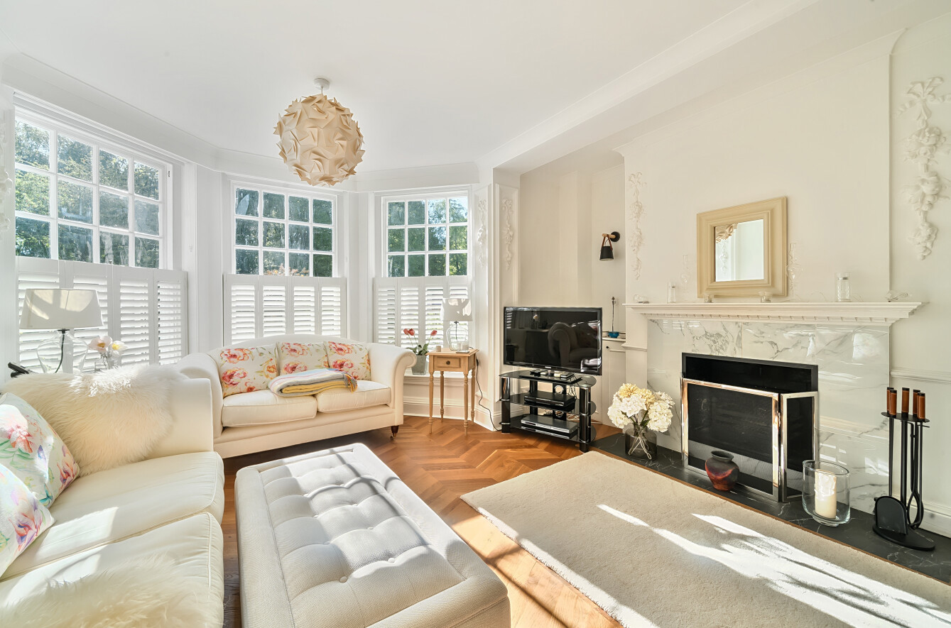 Inside, the apartment opens into a welcoming entrance hall, leading to a generously sized sitting room featuring a large bay window, original plasterwork, and a charming open fireplace perfect for cosy evenings. The space is flooded with natural light and showcases the elegance of the building's heritage.