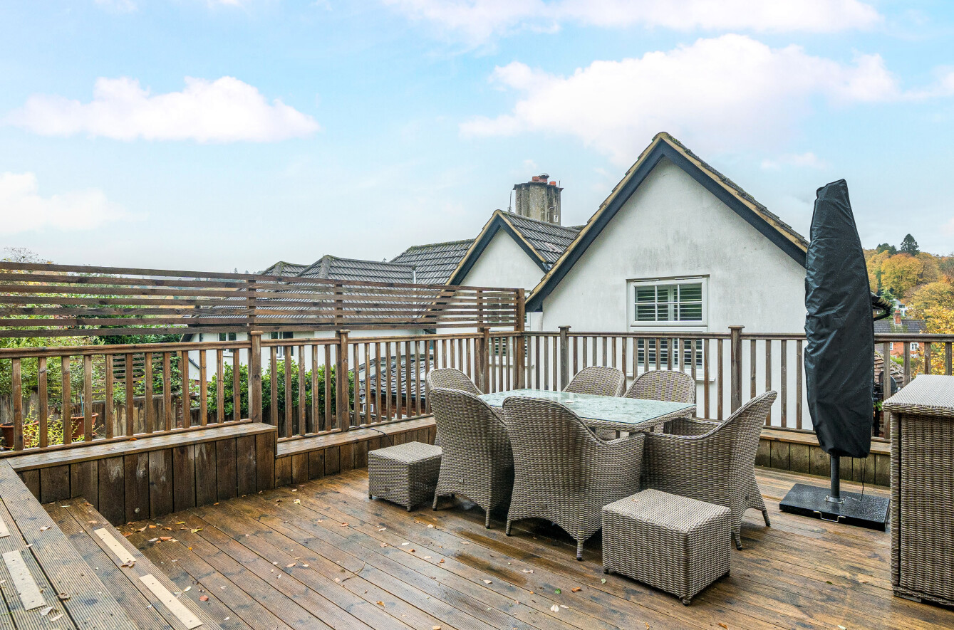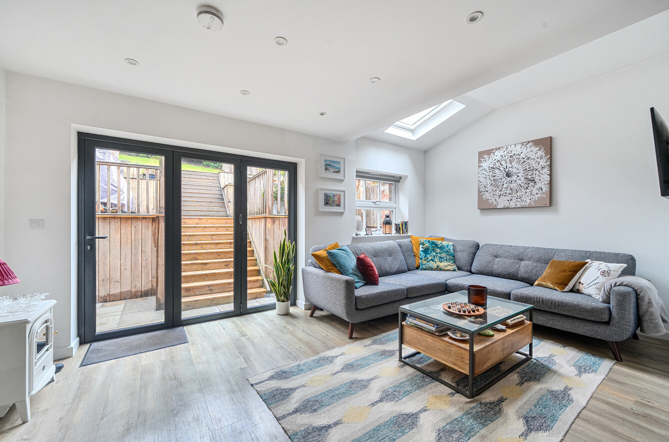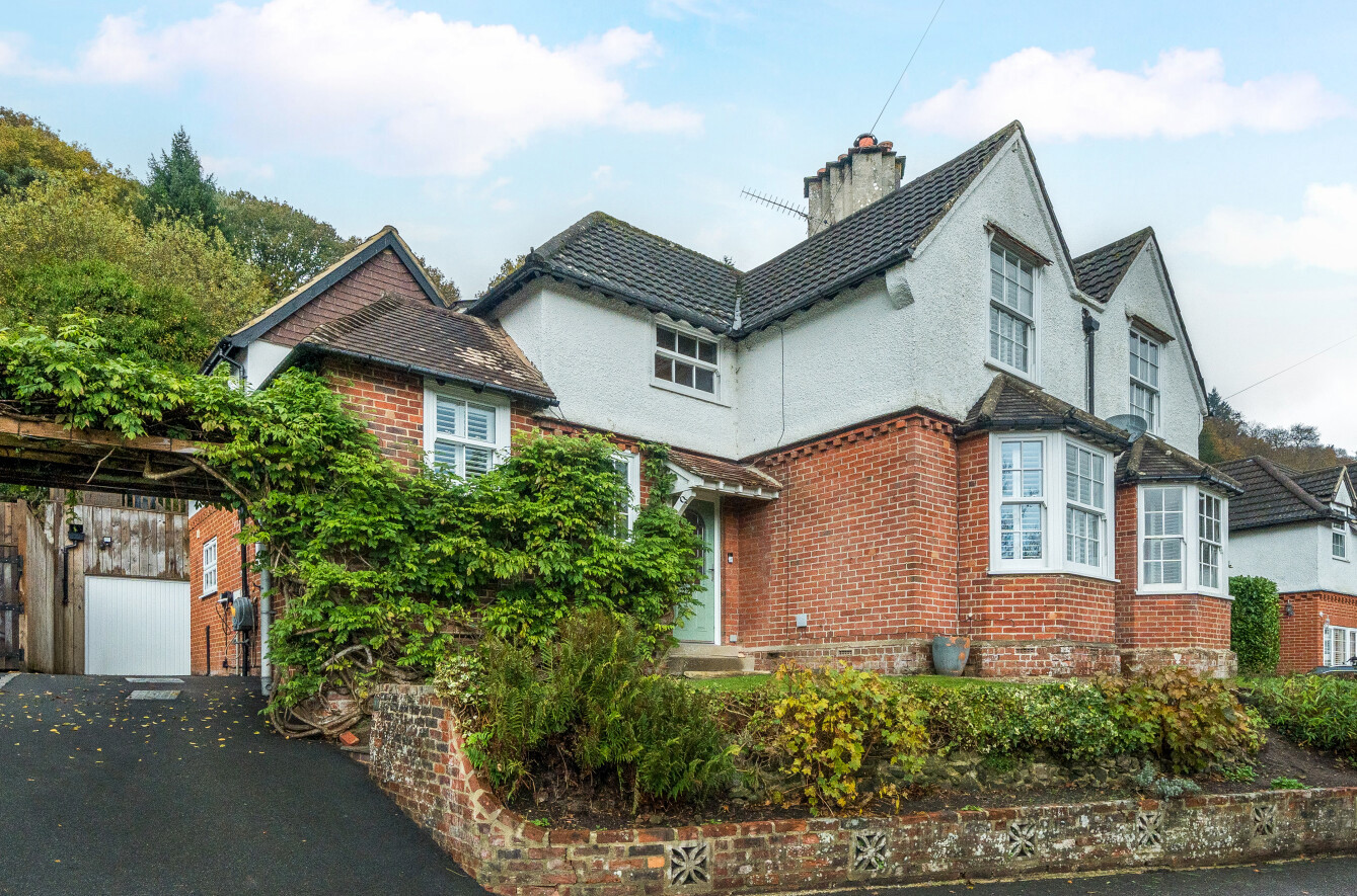 A deceptively spacious and superbly presented four-bedroom family home, positioned on the highly regarded Chiltcroft Road in Haslemere. Combining 1930s character with modern, open-plan living spaces, this beautifully extended property offers versatile accommodation of over 1,570 sq ft, generous gardens with elevated views, and a detached garage all set within a peaceful residential setting close to excellent schools, woodland walks and Haslemere town centre.Approached via a private driveway, the house immediately impresses with its charming period façade. The blend of red-brick lower elevations, white rendered upper walls and decorative gables creates a quintessentially English feel, complemented by mature greenery that softens the frontage.Upon entering, the sense of space and light is immediately apparent. The welcoming hallway gives access to the main reception rooms and features subtle period detailing. To the front of the house sits the elegant sitting room, complete with a striking traditional fireplace, tiled hearth and a deep bay window fitted with plantation shutters. This room offers a warm, inviting atmosphere perfect for relaxing evenings or more formal entertaining.To the rear, the home opens out dramatically into a large open-plan kitchen, dining and family area, forming the heart of the property. The kitchen features an excellent range of solid wood cabinetry, expansive work surfaces, double ovens and integrated appliances, providing an ideal layout for those who enjoy cooking and socialising. Adjacent is the generous dining space, easily accommodating a large table, making it the perfect place for hosting family gatherings or dinner parties.Just beyond is the bright and airy family room, a beautifully finished space with a vaulted ceiling, skylights and wide bi-fold doors that open directly onto the garden steps. This seamless connection to the outside makes the room ideal for year-round living, flooding the interior with natural light and offering easy access to the terrace above.Also on the ground floor is a stylish and contemporary shower room, a separate utility room, and a versatile office/snug, ideal for home working, a playroom or a quiet reading space.The first floor provides four well-proportioned bedrooms, each with its own distinctive character. The principal bedroom enjoys elevated views towards the treetops and ample space for wardrobes. Bedrooms two and three are generous doubles, both bright and neutrally finished, while bedroom four offers flexibility as a nursery, guest room or additional study. A sleek and modern family bathroom completes the upstairs accommodation.The rear garden is a notable feature of the home, enjoying a sense of privacy and elevation. Arranged across several levels, it includes a raised terrace directly above the family room, perfect for outdoor dining and entertaining while enjoying views across Haslemere. Further down, lawned areas provide excellent space for children to play, with mature trees and planting creating a leafy and tranquil backdrop. To the side, there is further storage and access.A detached garage sits to the right of the property, alongside driveway parking for multiple vehicles.Chiltcroft Road is a quiet and sought-after residential location, popular for its family-friendly environment and proximity to both town and countryside. Haslemere town centre offers a range of boutique shops, cafés, pubs and restaurants, while the mainline station provides fast and frequent services to London Waterloo. The area is also renowned for its excellent schooling options and immediate access to stunning natural landscapes including Blackdown, Hindhead Commons and the Devil's Punch Bowl.This exceptional home offers a rare combination of character, space and modern convenience in one of Haslemere's most desirable settings ideal for families seeking a beautifully balanced lifestyle close to amenities and nature alike.