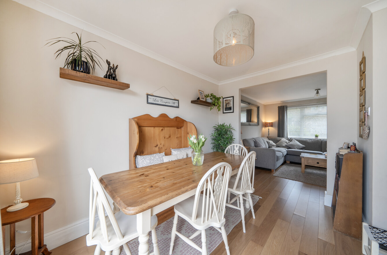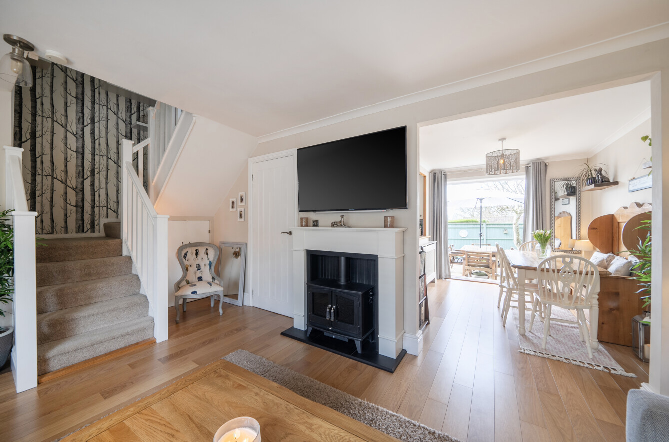 Upon entering the property, the ground floor has been carefully opened up to create a warm and cosy living room to the front of the house, providing an inviting space to relax complimented by a cosy electric fireplace. To the rear, the kitchen and dining areas overlook the garden. These rooms are cleverly connected to create a semi open plan space with a sociable flow. Both rooms enjoy pleasant views across the rear garden, with the dining area providing direct access outside through French doors. A convenient downstairs W/C completes this floor.