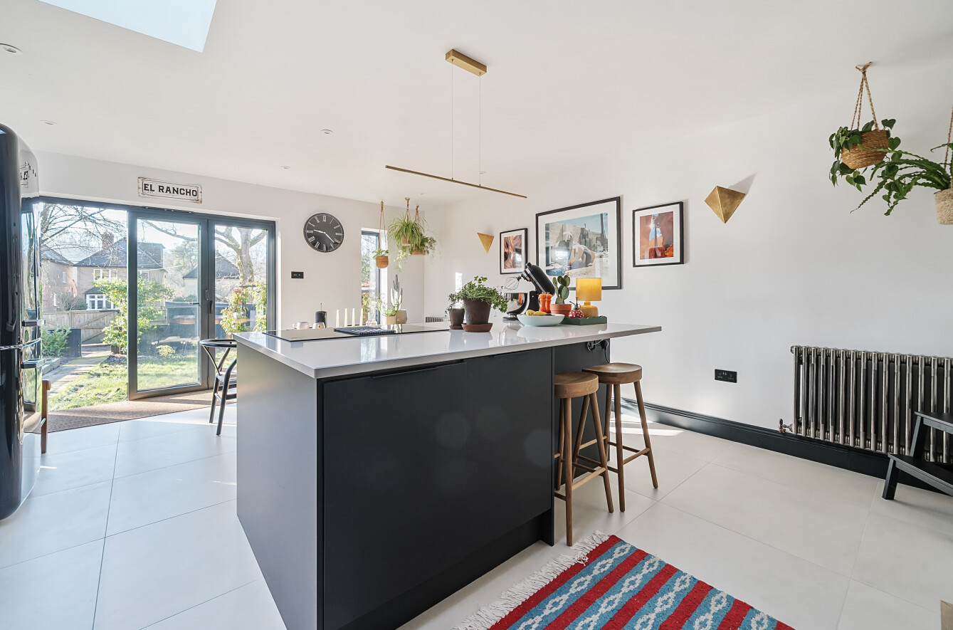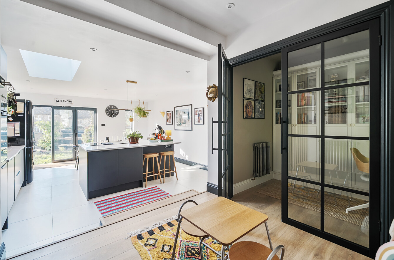 The ground floor comprises a separate living room to the front which could also be used as a playroom/office. To the rear, the property has been extensively extended and now offers an open plan kitchen/diner with a central island as the vocal point. The kitchen is stepped down which allows the high ceilings to be flooded with natural light coming in via the large bifold doors. Boasting integrated appliances along with plentiful worktop space, the kitchen provides a space to enjoy as a family or to entertain friends. A home office has been created to allow a stylish 'work from home' area whilst being set within the heart of the home.