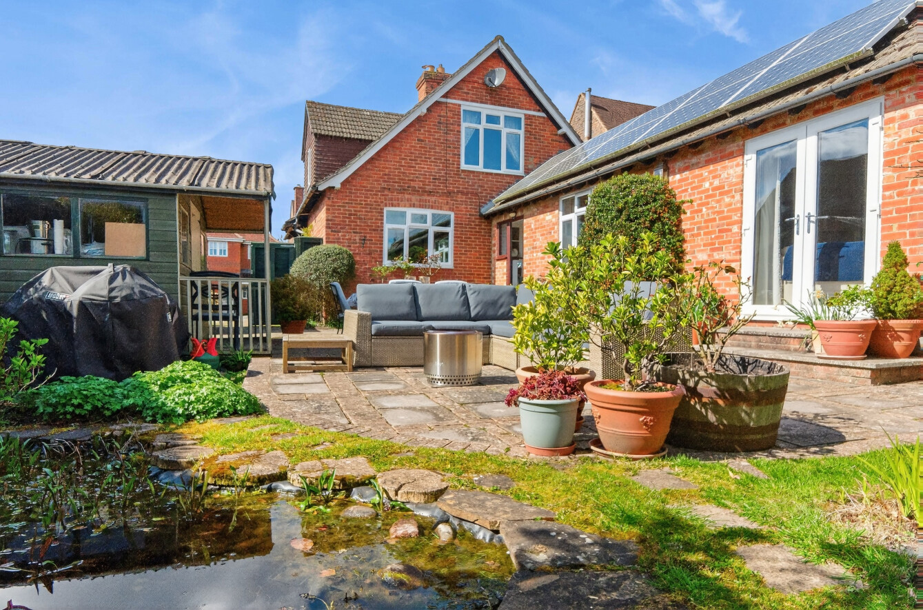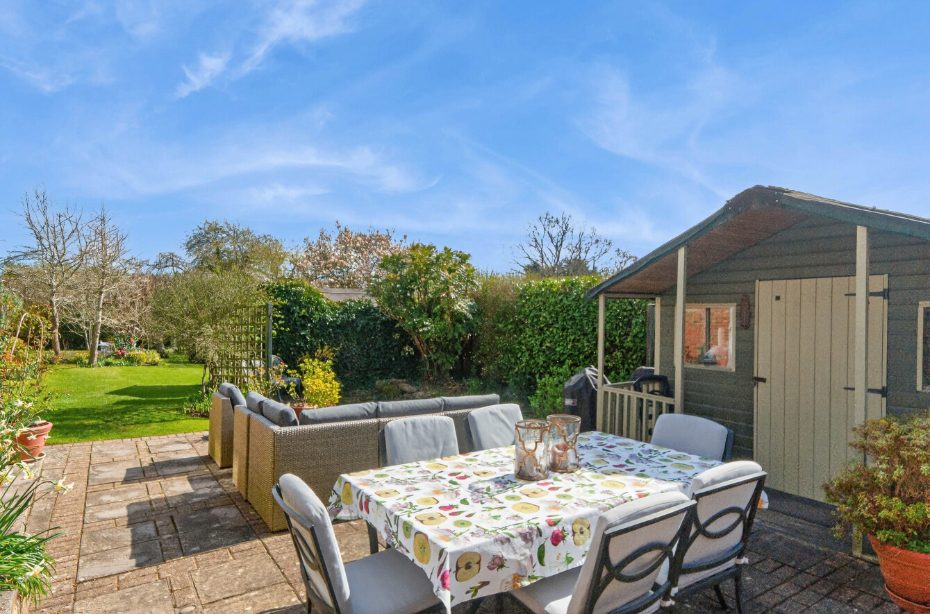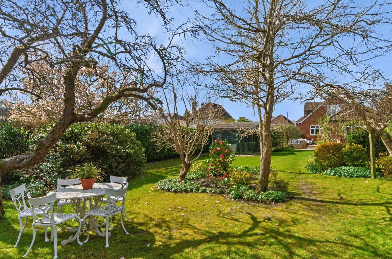To the rear, the garden is predominantly laid to lawn, interspersed with mature trees, established planting, and colourful borders, creating a picturesque outdoor space that evolves beautifully through the seasons. A patio area provides the perfect setting for al fresco dining and summer entertaining, with plenty of room for seating and outdoor furniture.