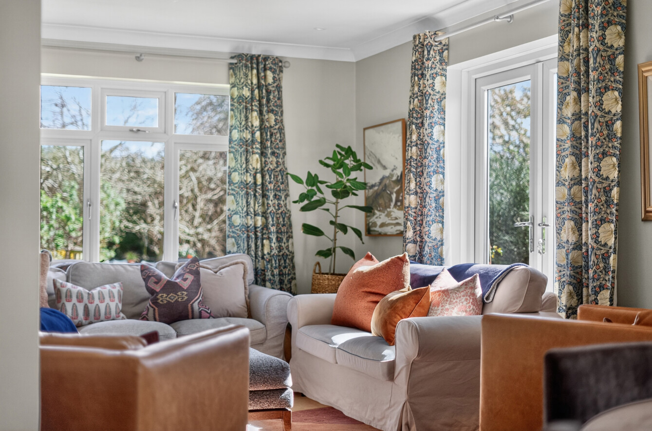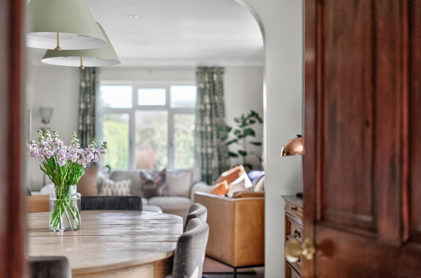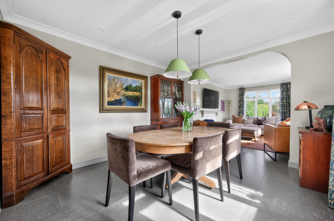The adjoining dining room offers a defined yet connected space, ideal for formal dining or more casual gatherings, with ample room for a large table and views across the garden.