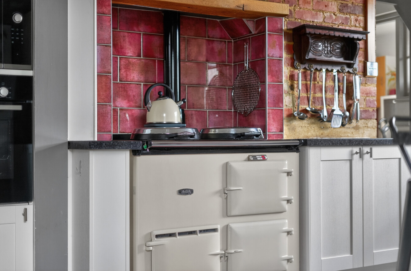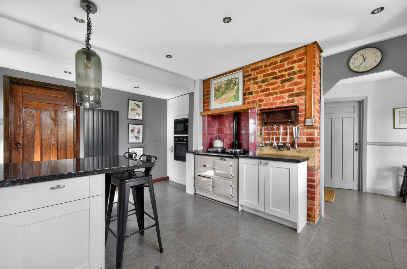 The kitchen has been stylishly updated to provide a modern and highly functional space. Fitted with a range of contemporary units and integrated appliances, it is further enhanced by a peninsular breakfast bar, perfect for informal dining or social cooking. A characterful exposed brick wall and Aga add warmth and personality, blending seamlessly with the modern finishes.