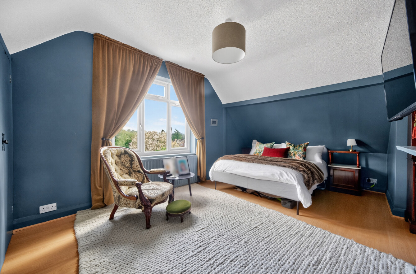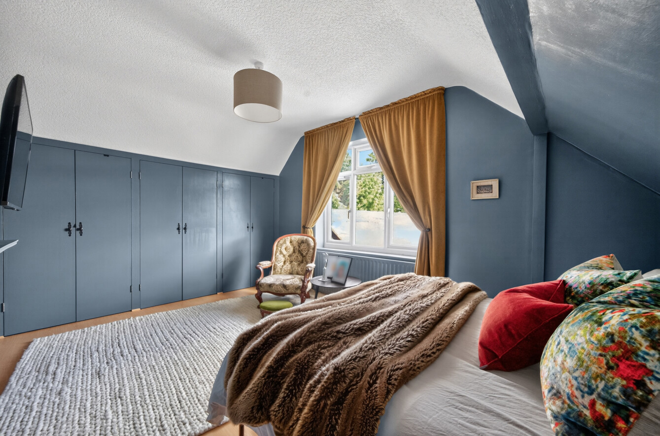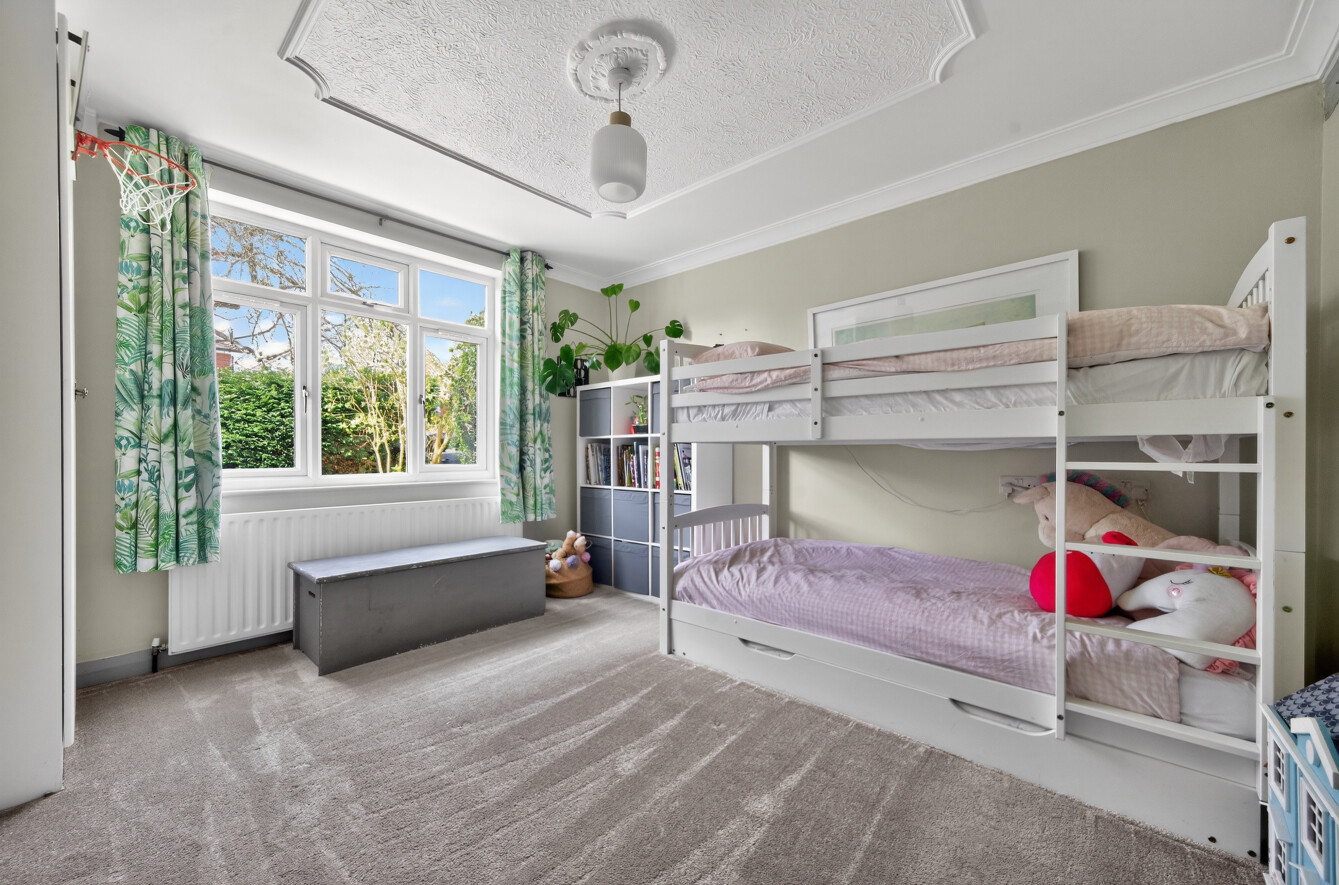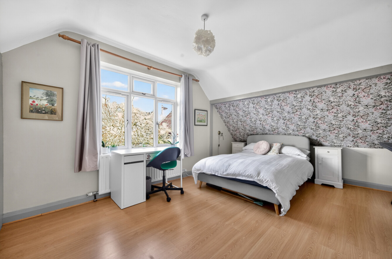 The principal bedroom is particularly spacious, benefitting from built-in storage and an abundance of natural light. The second bedroom is equally well-presented and enjoys a pleasant outlook. Both rooms feature characterful ceiling lines, adding to the charm and individuality of the home.