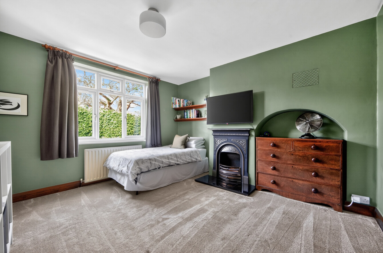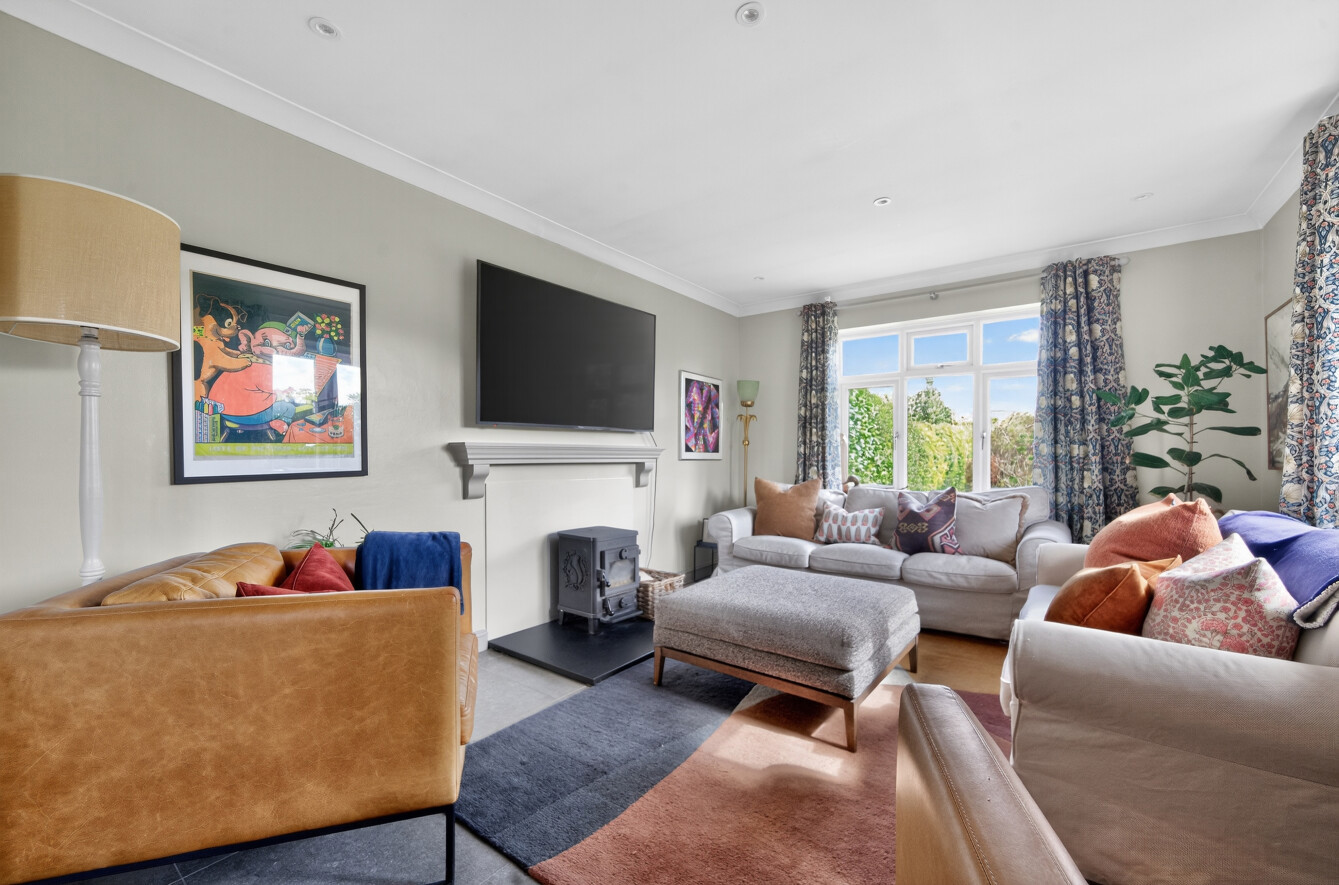 To the rear of the property lies a beautifully proportioned living room, flooded with natural light from large windows and glazed doors opening directly onto the garden. A feature wood-burning stove creates a cosy focal point, making this an inviting space year-round, equally suited to relaxed family evenings or entertaining guests.
