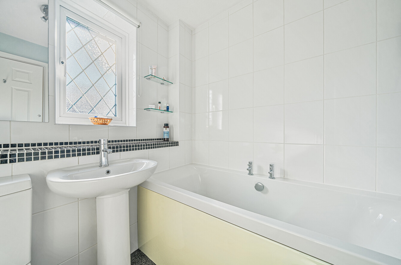 The family bathroom has been recently updated to offer a modern and stylish space, featuring a contemporary white suite, including a bath with an overhead shower, a washbasin, and a low-level WC. High-quality fixtures and fittings, along with tasteful tiling, complete the bathroom to an excellent standard.