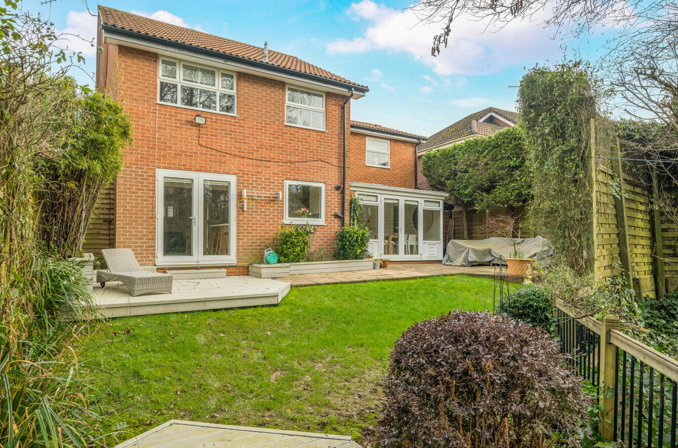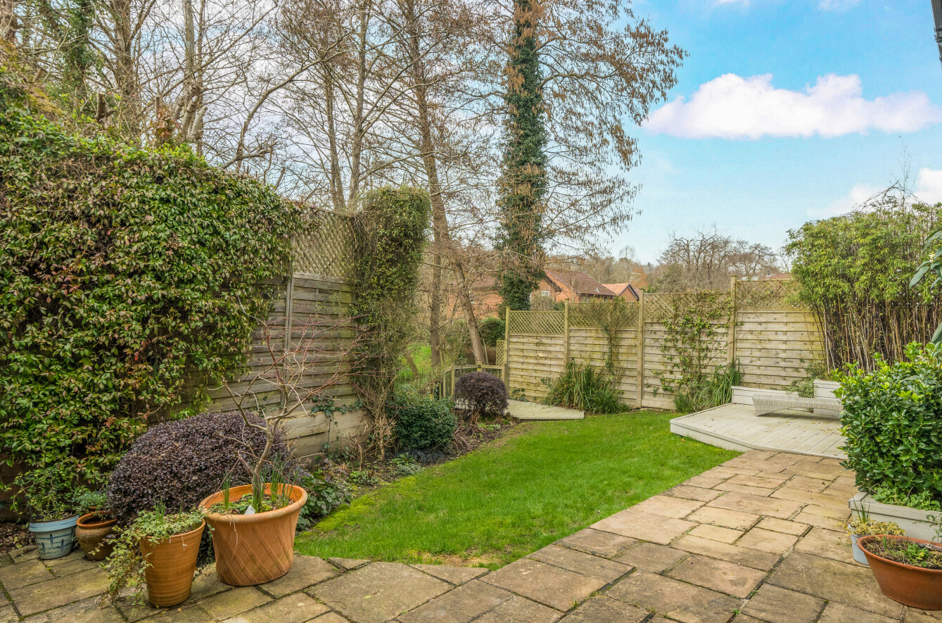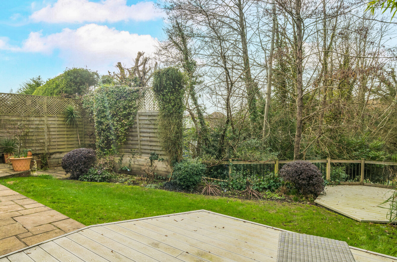 To the rear, the garden provides a peaceful and private setting, with a paved terrace immediately adjoining the house, ideal for entertaining, leading onto a lawn bordered by mature shrubs and trees. A raised decked seating area enjoys a pleasant outlook over the rear boundary, enhancing the sense of seclusion.