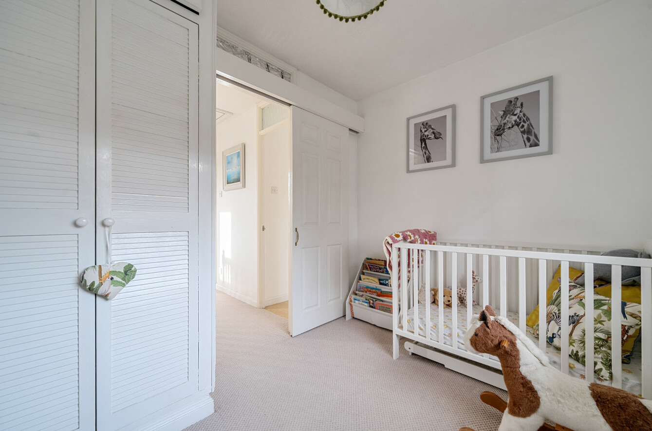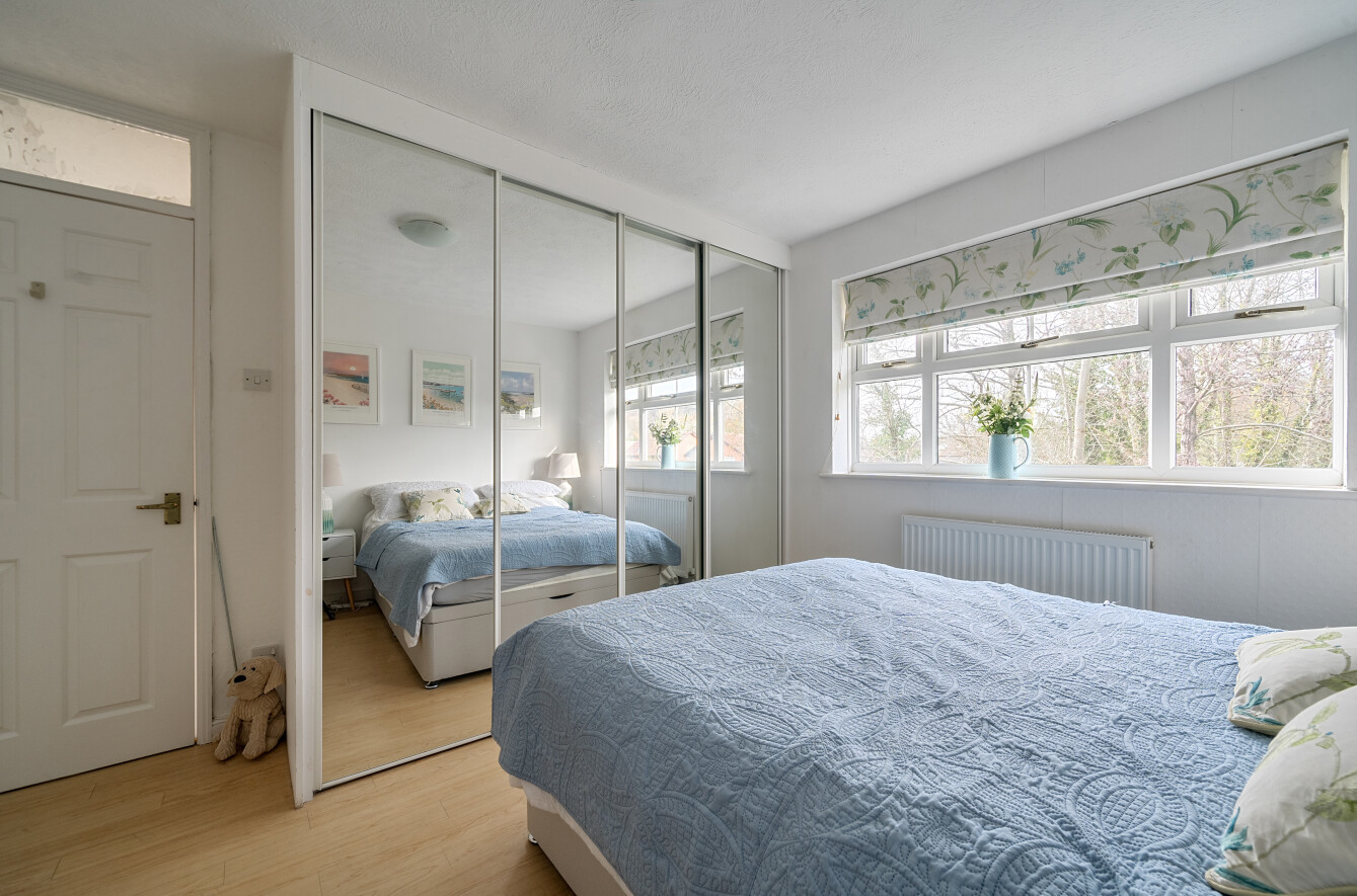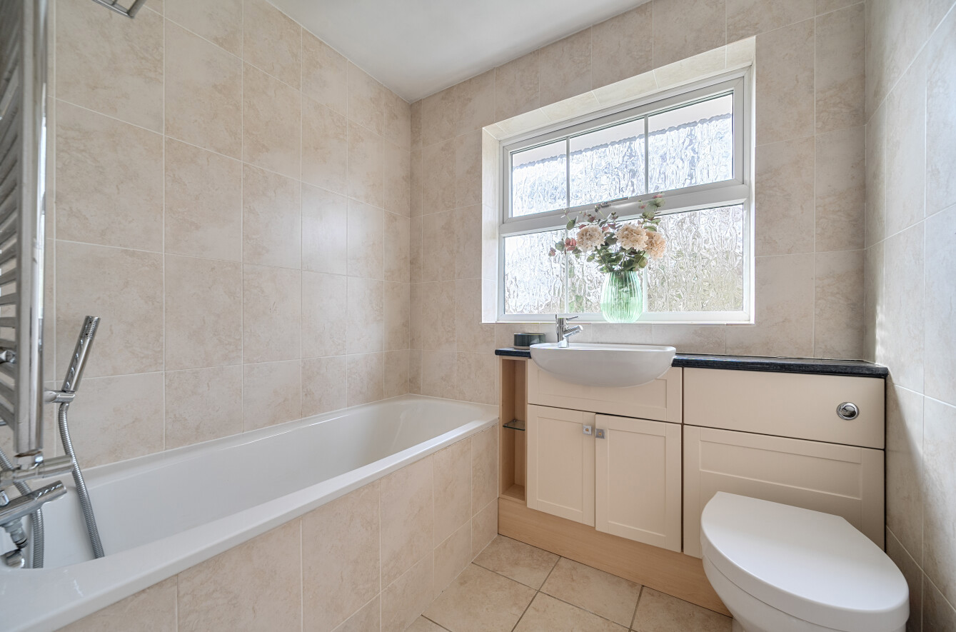 To the rear, the garden provides a peaceful and private setting, with a paved terrace immediately adjoining the house, ideal for entertaining, leading onto a lawn bordered by mature shrubs and trees. A raised decked seating area enjoys a pleasant outlook over the rear boundary, enhancing the sense of seclusion.