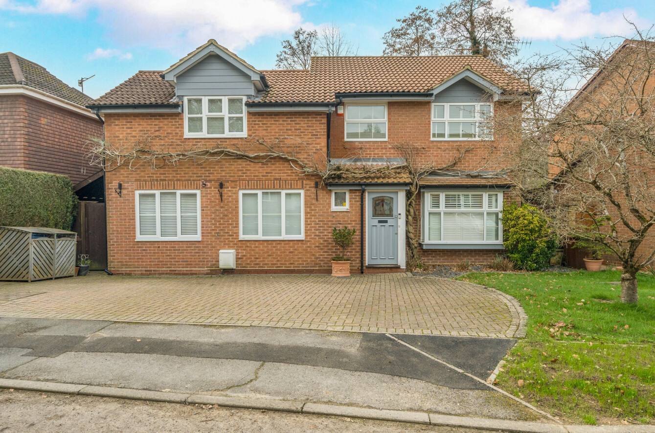 The property is approached via a generous block-paved driveway providing ample off-road parking, with an attractive brick façade and mature planting creating an inviting first impression.