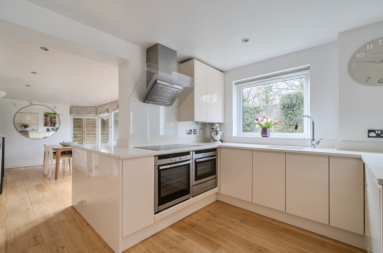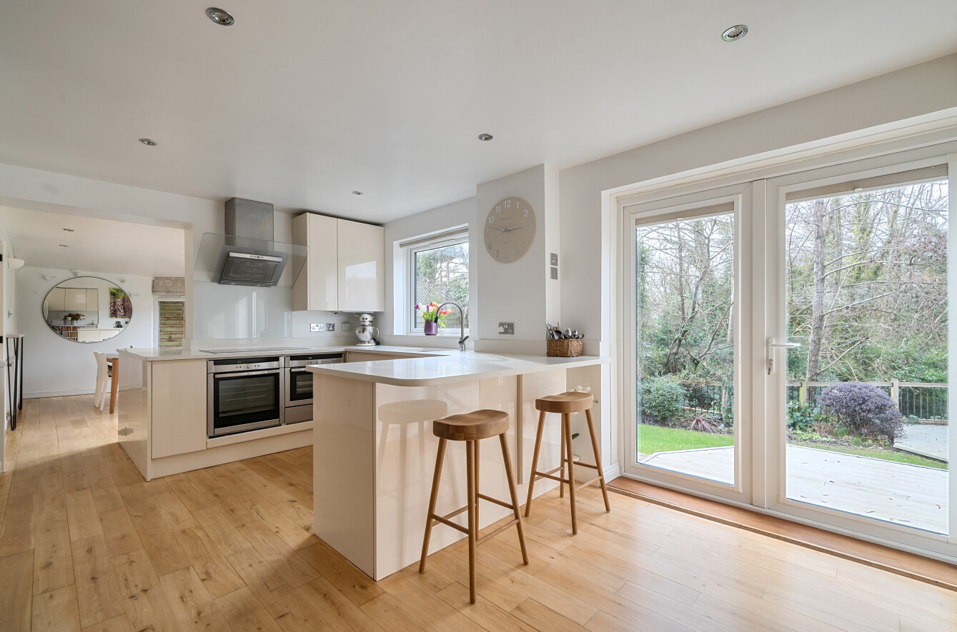 Internally, the ground floor has been designed with modern family living in mind. A welcoming entrance hall leads through to a superb open-plan kitchen/breakfast/family room fitted with sleek contemporary units, integrated appliances and a central peninsular breakfast bar. Large glazed doors open directly onto the rear terrace, seamlessly connecting indoor and outdoor spaces and allowing for an abundance of natural light.