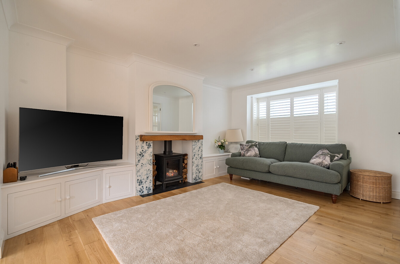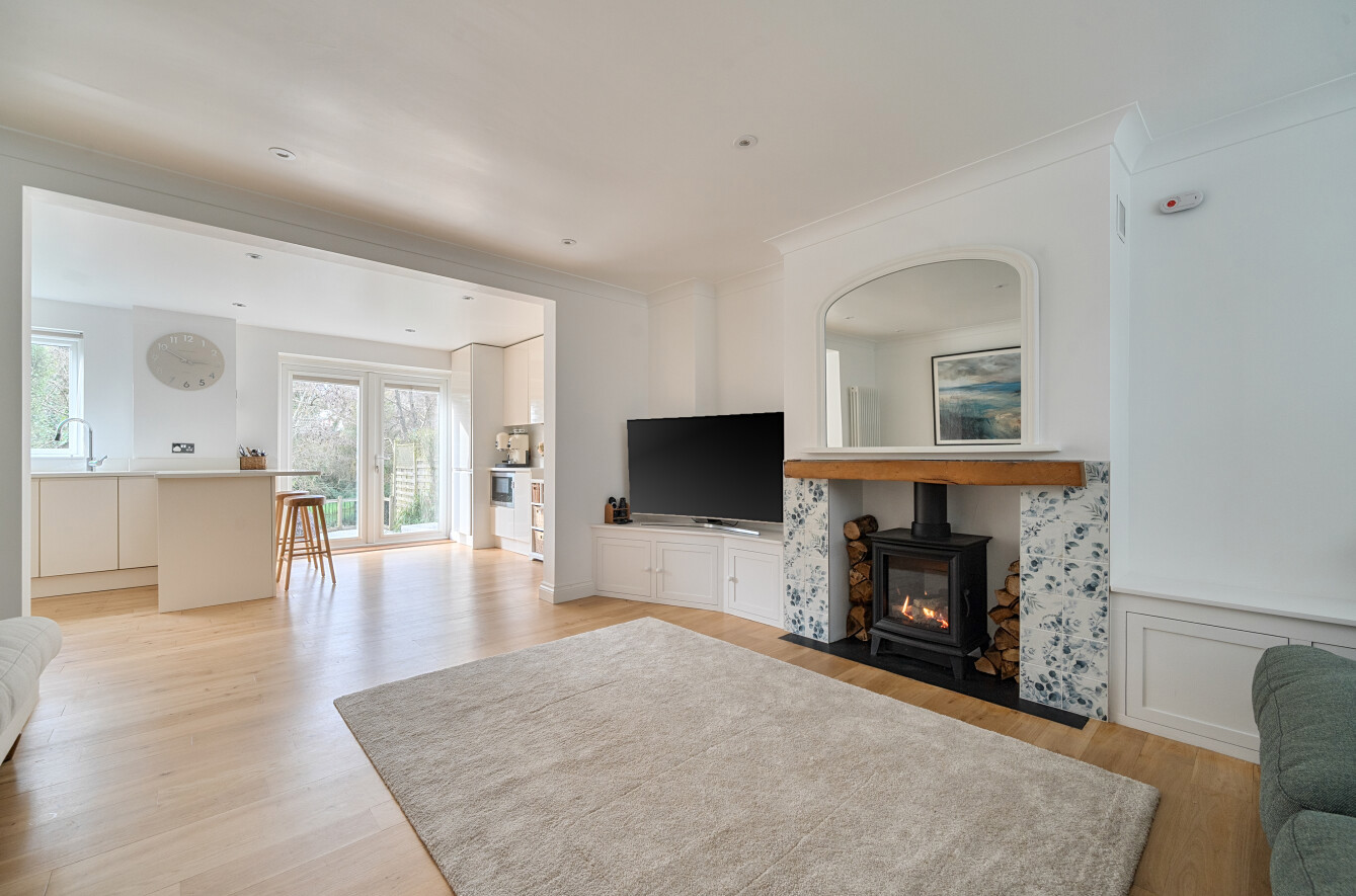 Flowing from the kitchen is the spacious family room featuring a stylish gas stove and bespoke cabinetry, creating a cosy yet sociable environment. In addition, there is a separate reception room to the front of the property, ideal as a formal sitting room or playroom and again features a modern gas stove, together with a separate dining room offering further flexibility. A utility room and ground floor cloakroom complete the downstairs accommodation.