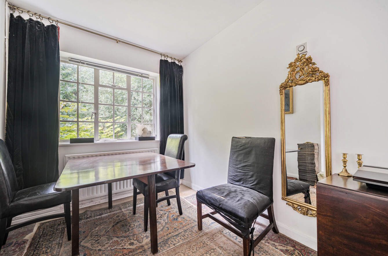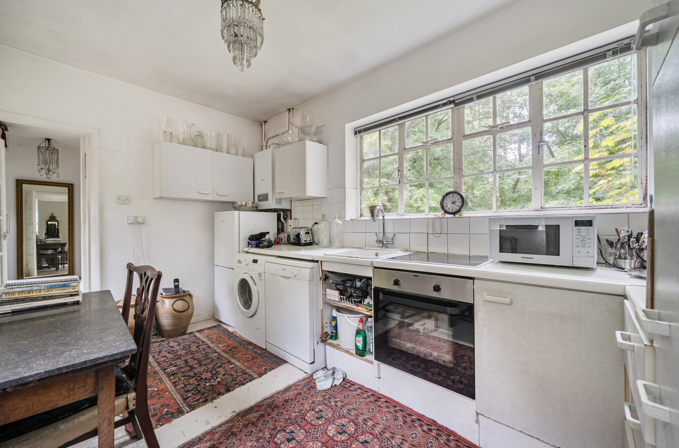The kitchen/dining room looks out over greenery to the rear, providing an ideal space to reimagine as a contemporary kitchen. From here, there is access to two bedrooms, each with views over the garden or court yard, as well as a bathroom fitted with a traditional suite.