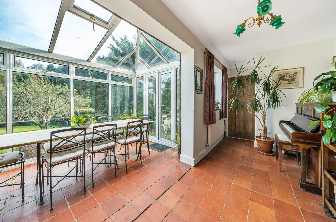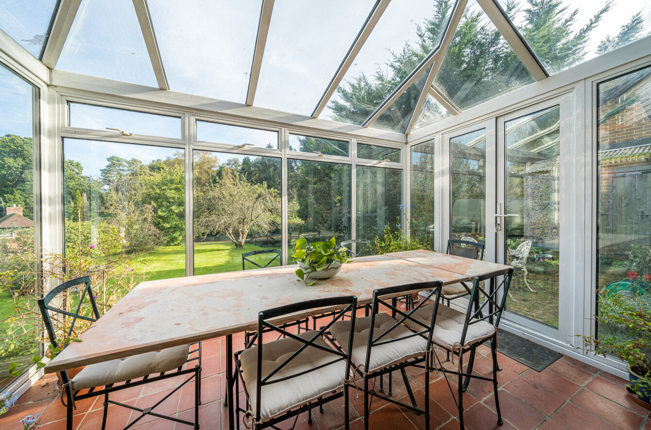 The family room serves as a flexible space for daily living and connects effortlessly to the dining room, which in turn leads into the kitchen/breakfast room. The kitchen is both practical and welcoming, with ample storage and room for casual dining. Adjacent to the kitchen, a conservatory extends the living space further, offering a delightful spot to enjoy the garden's views throughout the seasons.