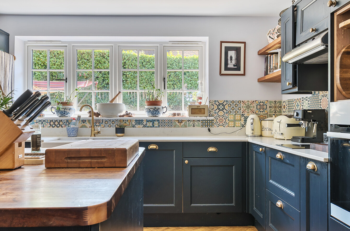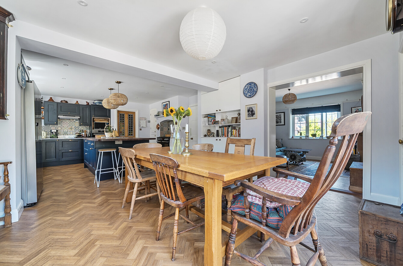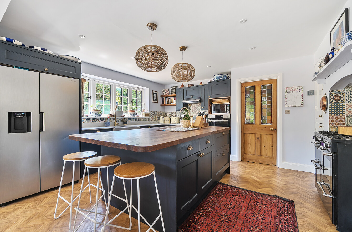 To the rear, the house opens up dramatically into an impressive and beautifully designed kitchen/dining/family room, measuring over 25 feet in length. This light-filled space is very much the hub of the home, ideal for modern living. The dark navy cabinetry is paired with timber worktops and encaustic-style tiling for a timeless, artisan feel. A large central island with breakfast bar creates a sociable cooking and gathering space, while the dining area offers plenty of room for entertaining, framed by windows and French doors that lead directly out to the sunny rear garden.