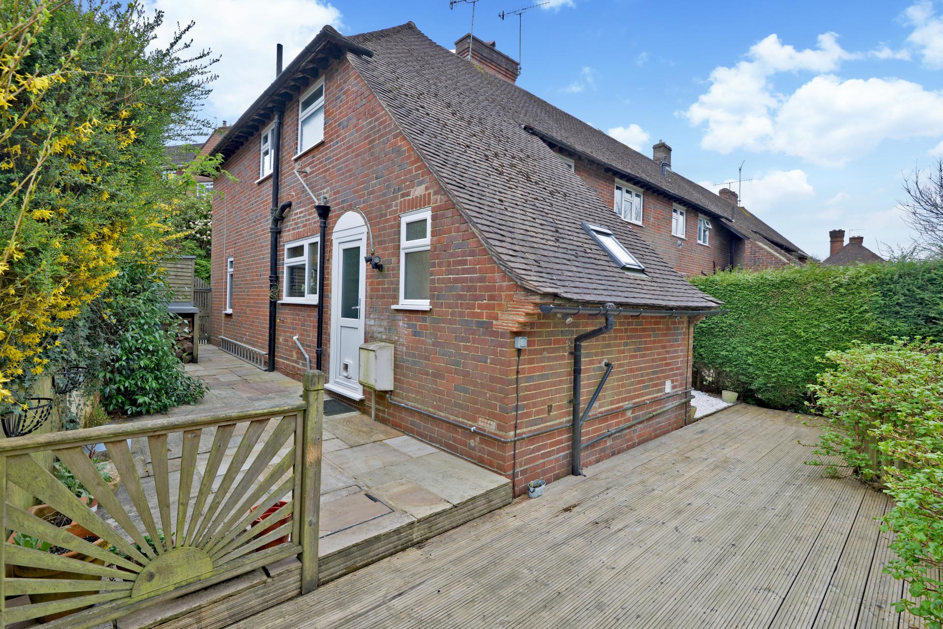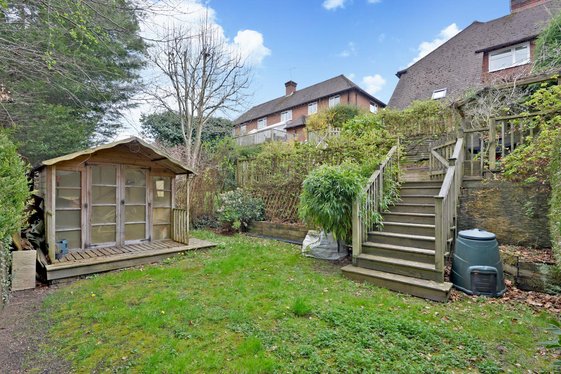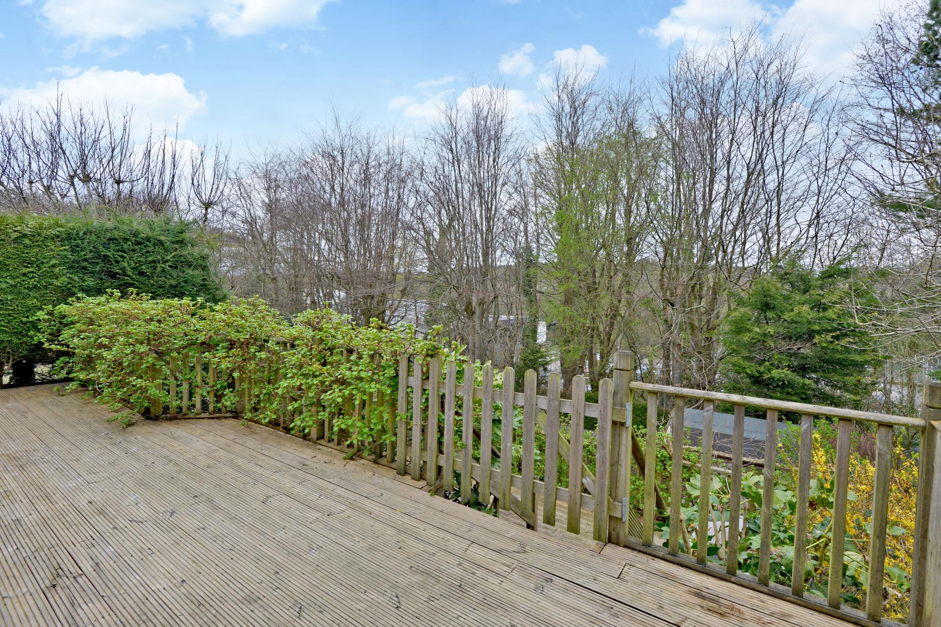 The outdoor spaces are a true highlight of this property. The front of the house is accessed via steps down, with the area enclosed by high hedging for privacy. A side gate provides access to the rear garden, which is thoughtfully arranged across three tiers. The top tier features a terraced area ideal for entertaining, while the second tier offers a decked space for al fresco dining or relaxing. The lower tier, mainly laid to lawn, provides a tranquil retreat, all within a setting of high privacy and seclusion.