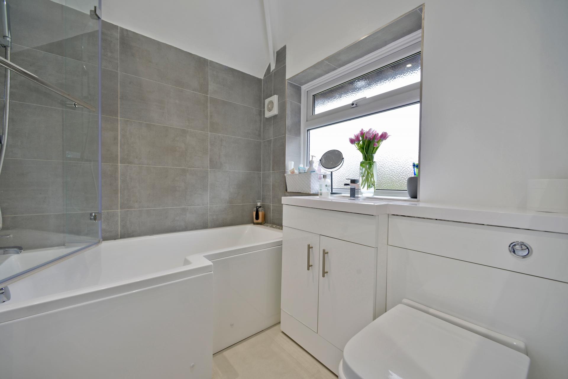 Upstairs, there are two spacious double bedrooms and a well-proportioned single bedroom, offering flexible options for family living, guests, or a home office. The family bathroom is a standout feature, boasting a sleek and contemporary design.