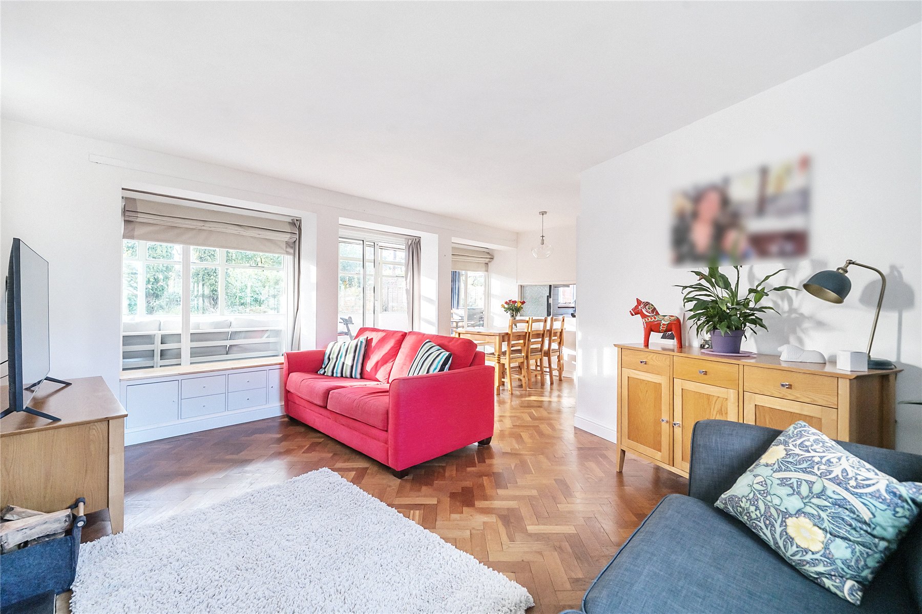 The heart of this home is the bright and sophisticated open-plan living and dining area, exuding a modern yet cozy ambiance. The warm herringbone wooden floors beautifully contrast with the crisp white walls, while expansive windows and glass doors invite an abundance of natural light, creating an airy and serene atmosphere. A charming log burner adds a touch of warmth and homeliness to this elegant space.
